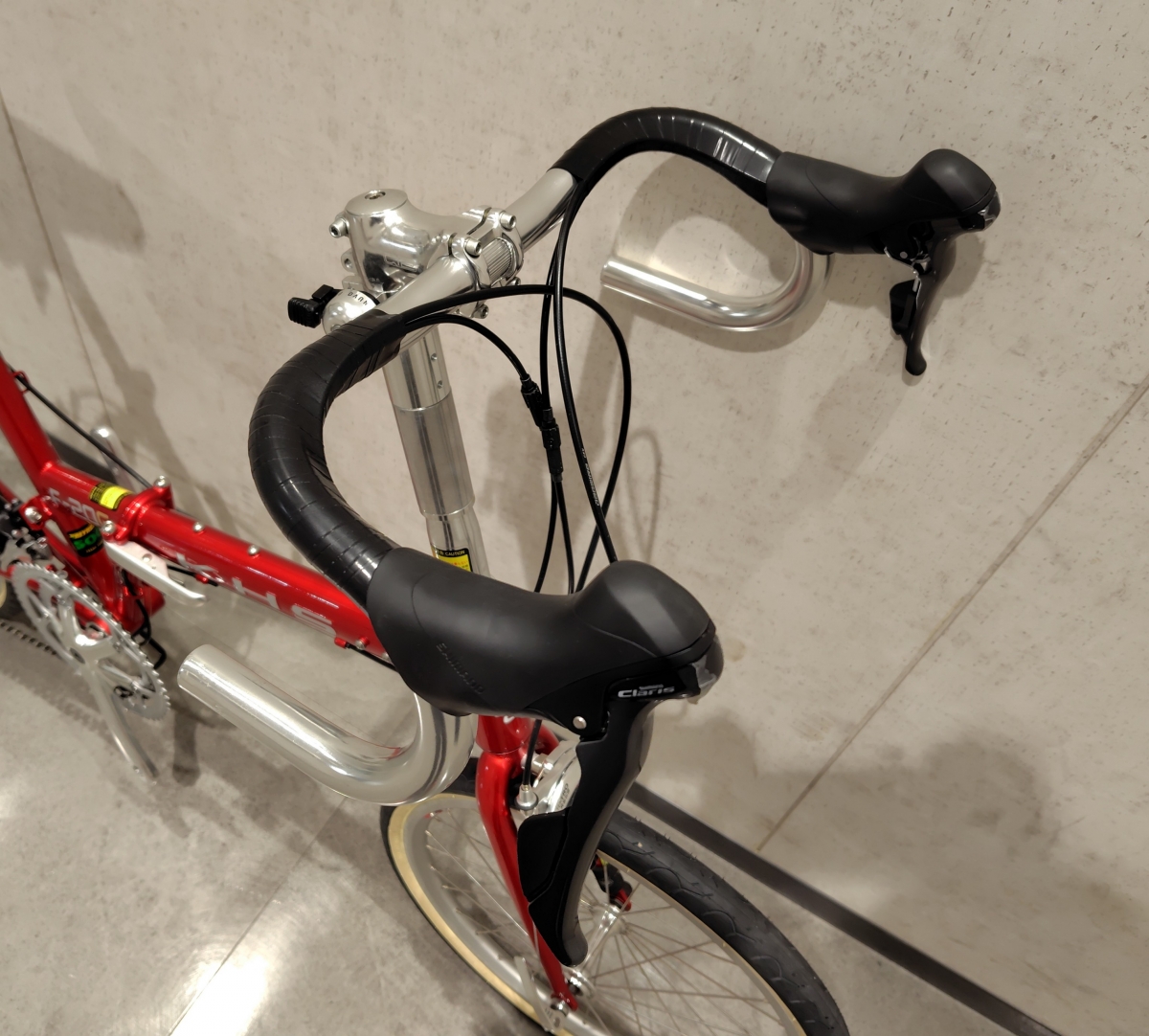 ハンドル幅は400mmとコンパクトなシャローハンドル形状で且つ若干エンド部分が広がっています。ハンドルはちょっとユニークな形をしています。ステムはハンドルクランプ径25.4mmで60mm長のアルミ製、デュアルコントロールレバーはシマノのクラリスです。