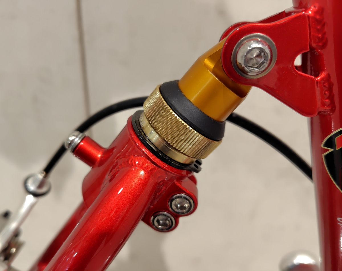 ヘッドチューブ上側のクイックレバーを開放してから、レバーの上に見えるボタンを押すと簡単にハンドル部分がはずれます。また取り付る際にセンターが出るようになっている為、センタリングの調整が不要です。はずしたハンドル部分は別売の「ハンドルコラム取付アダプター」を取付けて固定しますが、アダプターがない場合はハンドル部分がフリーな状態になるので持ち運ぶ時に袋の中で不安定になります。折り畳んだ状態を維持する「フォールディングマグネットセット」もあると便利ですが、この2点がない場合はマジック結束バンドなどが必要になります。輪行をされる際には事前に確認をしましょう。
