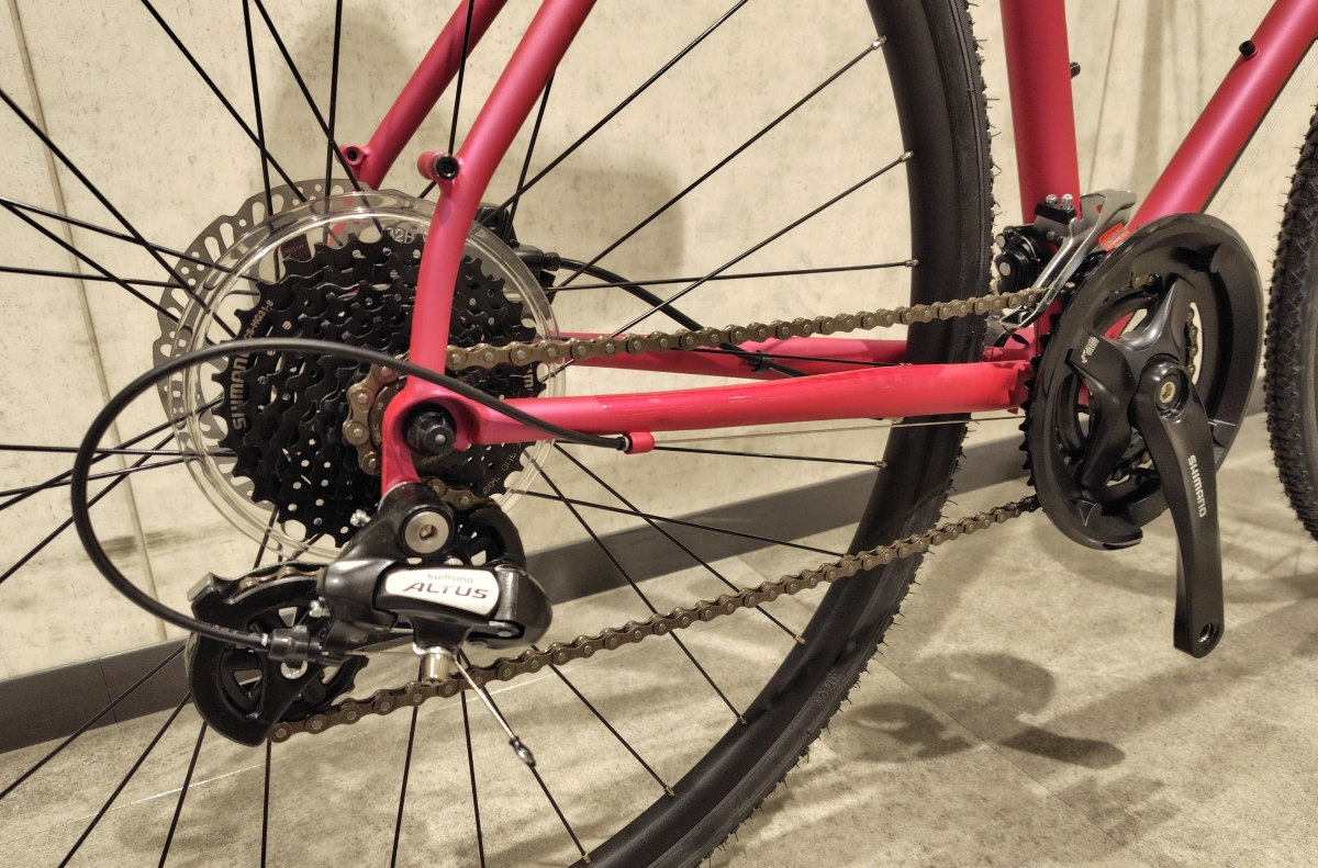 フロントチェーンリングはチェーンガード付きの46-30T、リヤスプロケットは11-32Tの8速で、全16段変速です。使いやすいワイドなギヤ構成になっています。タイヤは700X35cのブロックタイヤです。太めでブロックパターンのあるタイヤなので未舗装路区間でも安心です。