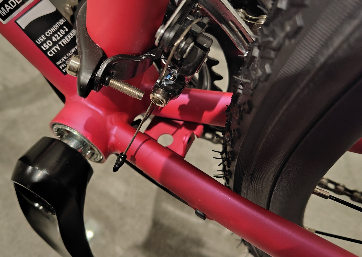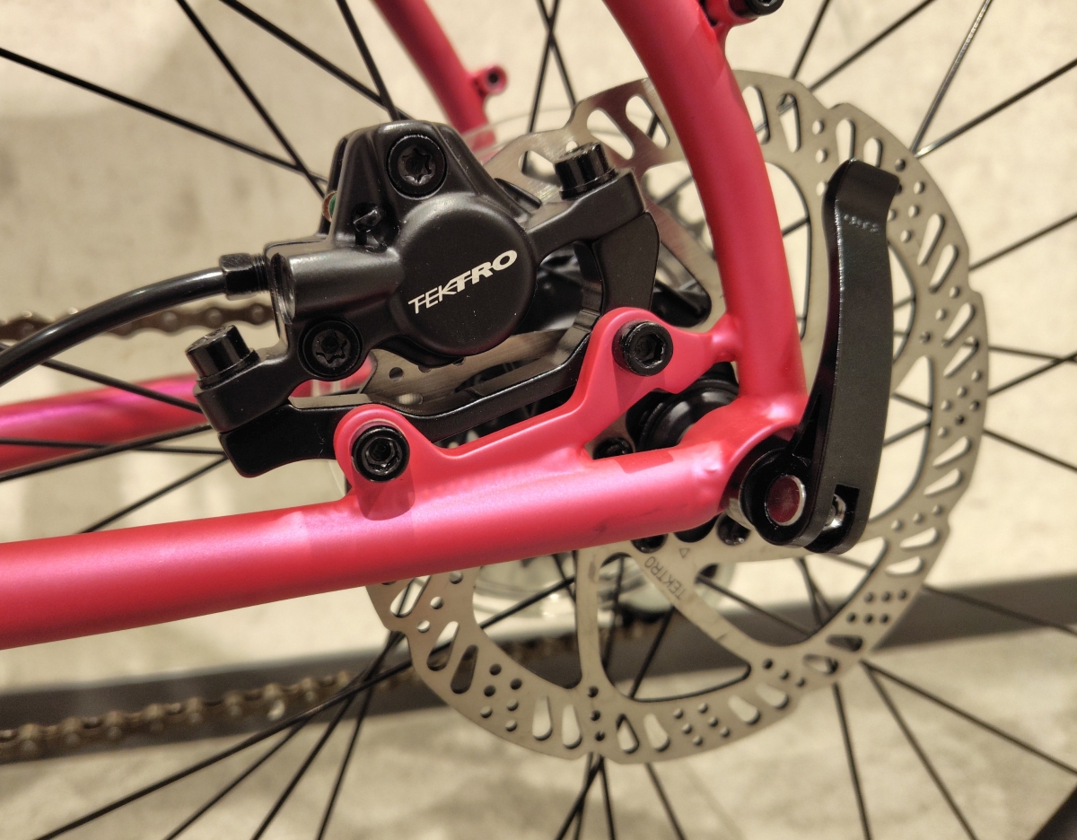 ブレーキはレバー側と同様テクトロの油圧ディスクブレーキです。油圧ディスクブレーキはレバーの引きが軽く、強く安定した制動力が得られるので様々なシーンで有用です。