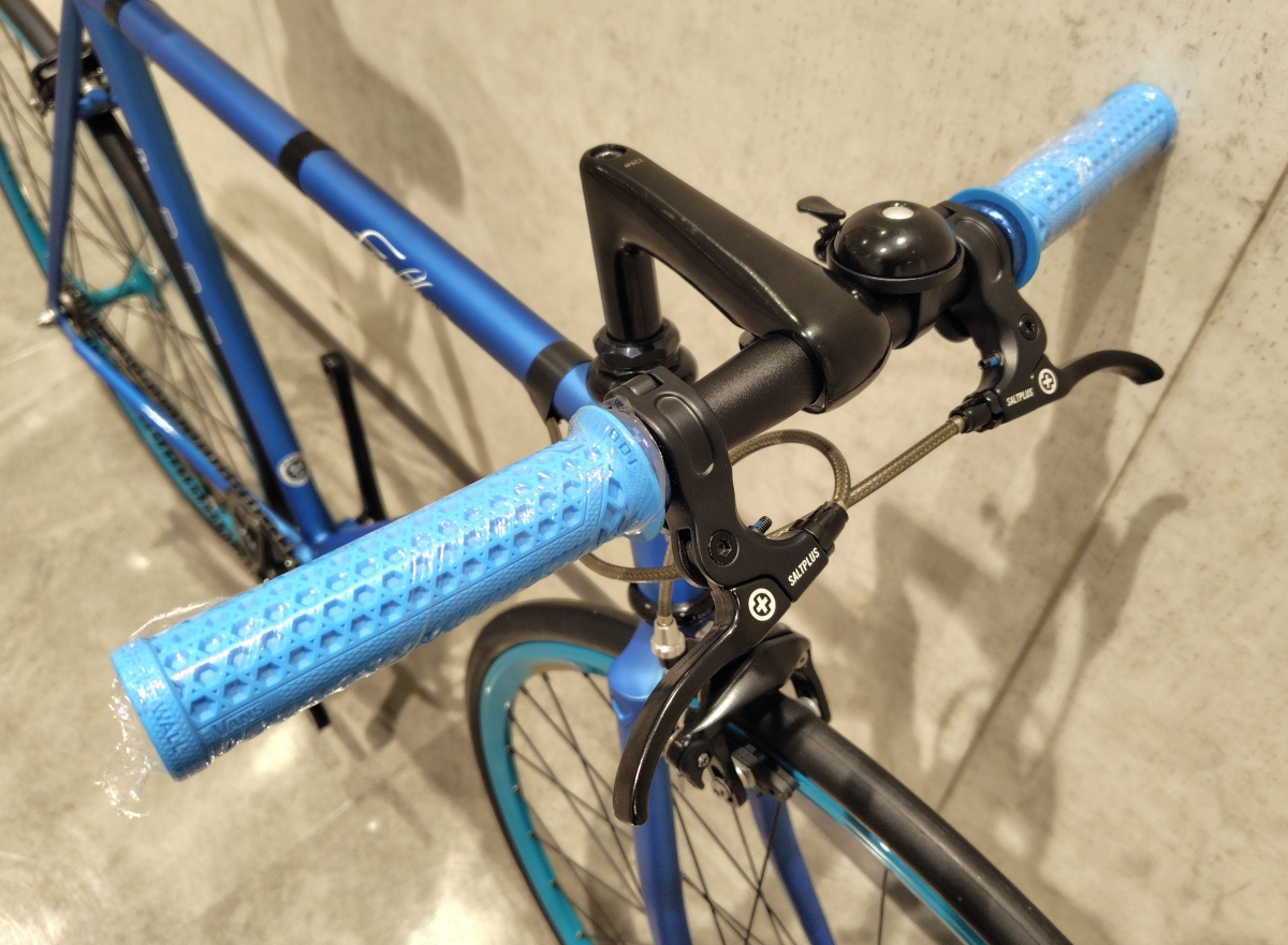 ハンドルをトラックタイプのものからフラットバーに換装し、グリップはODIのVANS V2.1を装着、ブレーキレバーはSALT PLUSのジオブレーキレバーに交換しています!グリップのパターンはシューズブランドで有名なVANSのソールパターンを踏襲したデザインです。握った感じは握りやすく、やわらかめなので疲れにくく快適性があります。グリップの固定方法がロックオンタイプで脱着が簡単です。ブレーキレバーはBMXのパーツブランド、SALTのSALT PLUSジオブレーキレバーでクランプ部分がオープンタイプになっています。