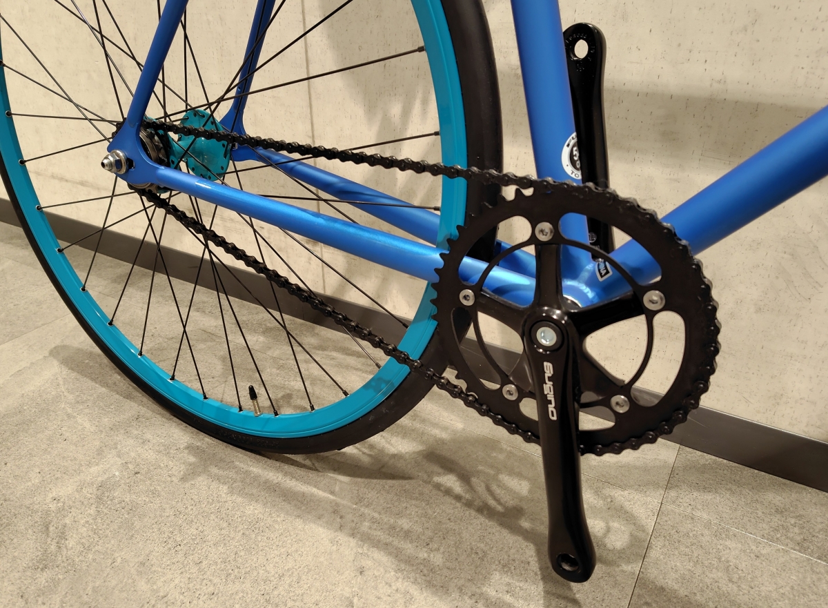 ギアはフロント側46T、リヤフリーコグが16Tです。サイズ違いのフリーコグのもございますので、ギヤを軽くしたい場合はご相談ください!
