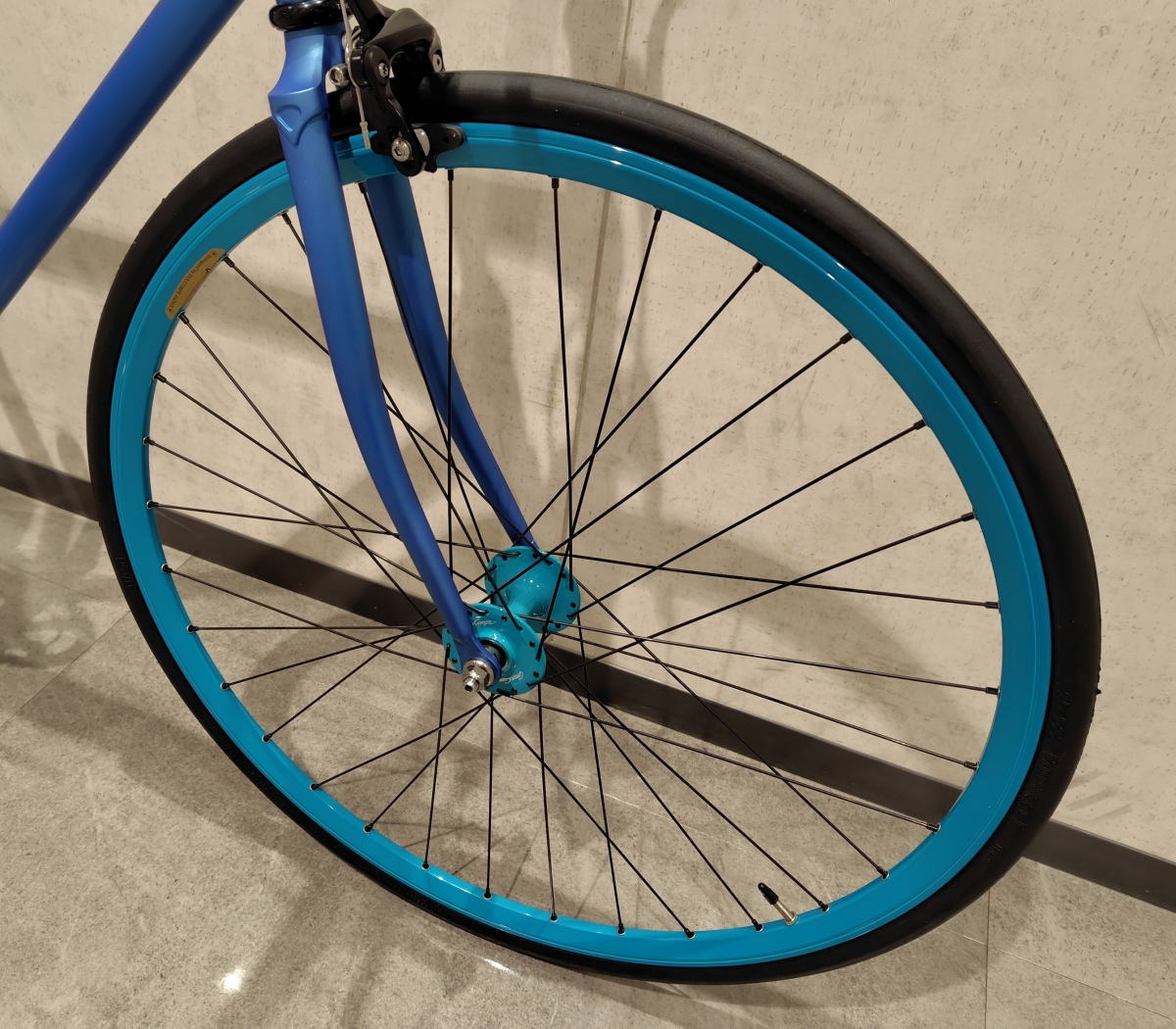 ホイールはGRAN COMPEのカラーハブとリムを黒スポークで組んだオリジナルホイール。車体のカラーはマットブルーで落ち着いた雰囲気ですが、グリップやホイールも青系にしているので個性的な雰囲気になっていますね!他とは違うシングルバイクが欲しいなら是非‼