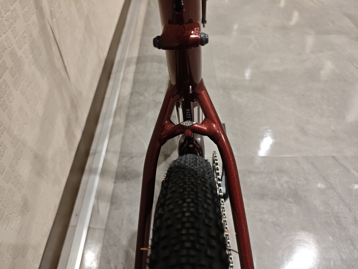 チェーンステーを長くしないままタイヤクリアランスを確保するため、途中から薄くなっています。