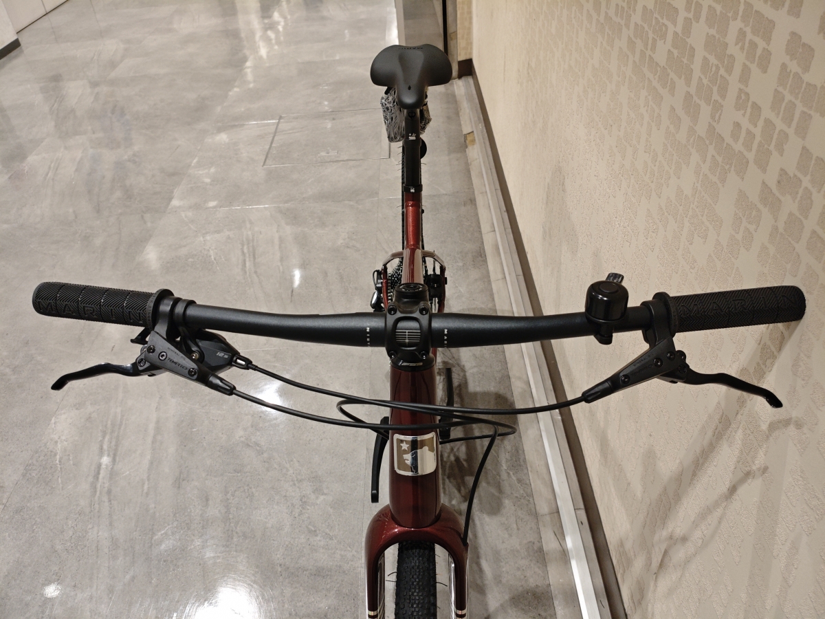 ハンドルは幅680mmのワイドなフラットバー。未舗装路でのコントロール性も良いですが、タウンライドやツーリングでは広すぎると感じるかもしれません。購入時にハンドルカットもご依頼いただけますのでご相談くださいませ。