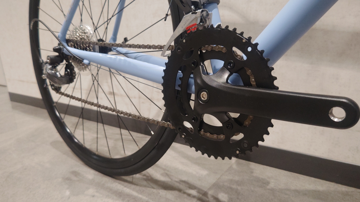 コンポーネントにはエントリーロードに良く使われるSHIMANO CLARISを採用。ギア比はクロスバイクよりは重めでしっかりスピードを出しつつ登坂も出来るレベル。