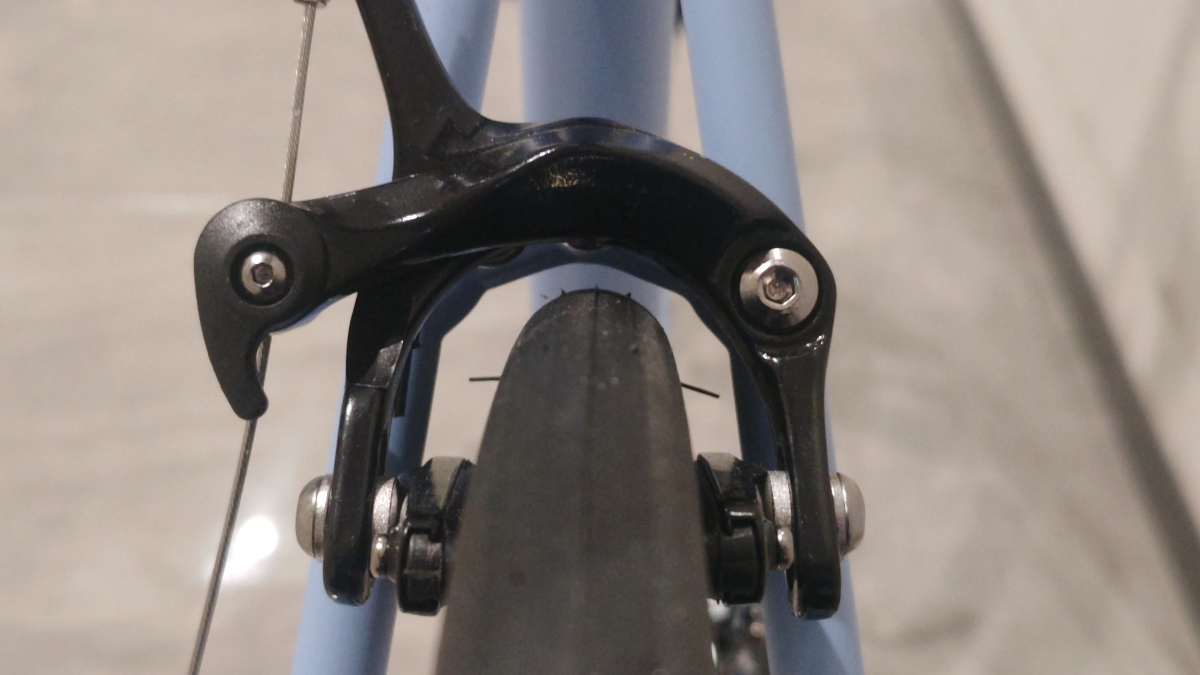 タイヤはデフォルトで700x25Cですが、ニューエトルト規格なら28Cが何とか入りそう。インチアップの恩恵としては安定感や衝撃吸収性能の向上が挙げられますが、ちょっと良いタイヤに変えるだけでも走行性能がガラッと変わるので最初から交換するのもオススメ。特に新規ご注文の際にタイヤ交換をご用命いただければ作業工賃が掛かりませんのでよりオススメだったりします。