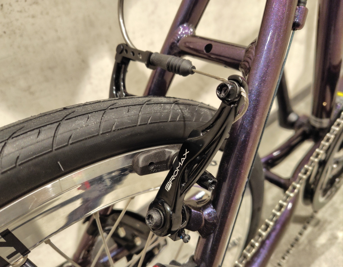 STIレバーだとノーマル長のVブレーキが使用に向かないので、ブレーキはノーマル状態のVブレーキからプロマックスのミニVブレーキに変更されています。レバーの引き代はロードと変わりませんが、制動のかかり方は気持ち強めな感じです。