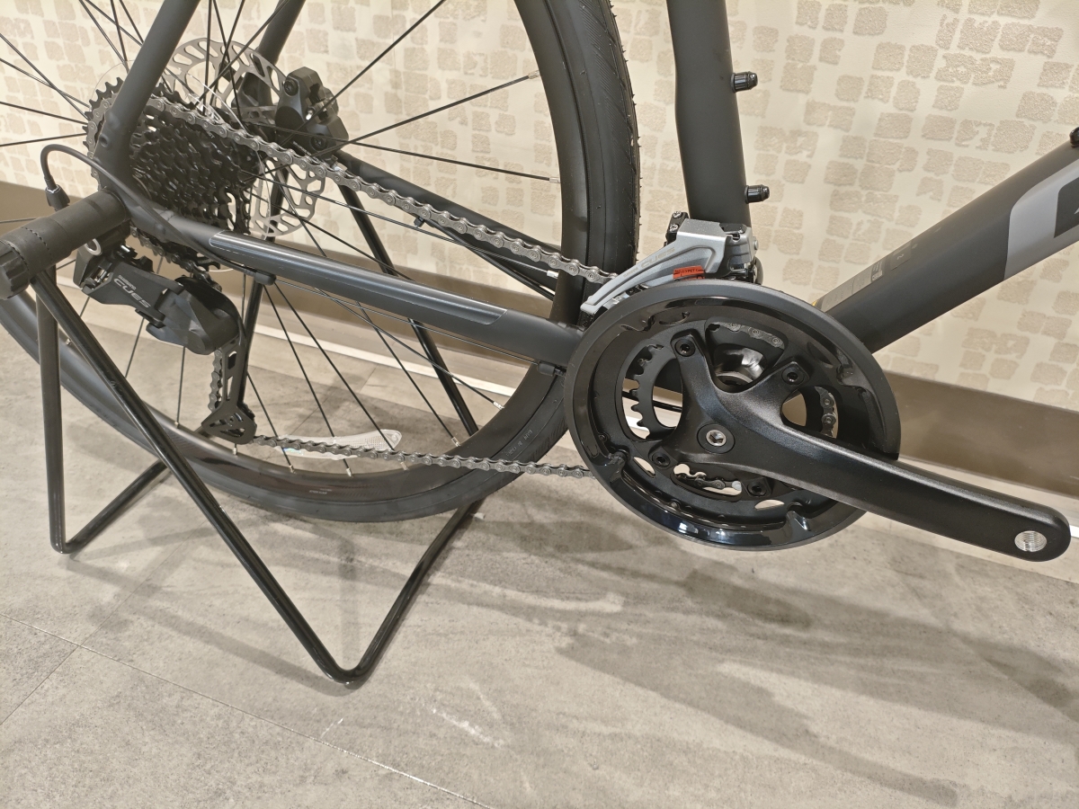 変速系統はシマノ CUES 2×9速。ミドルグレードのバイクとしてはベーシックな構成ですね。
