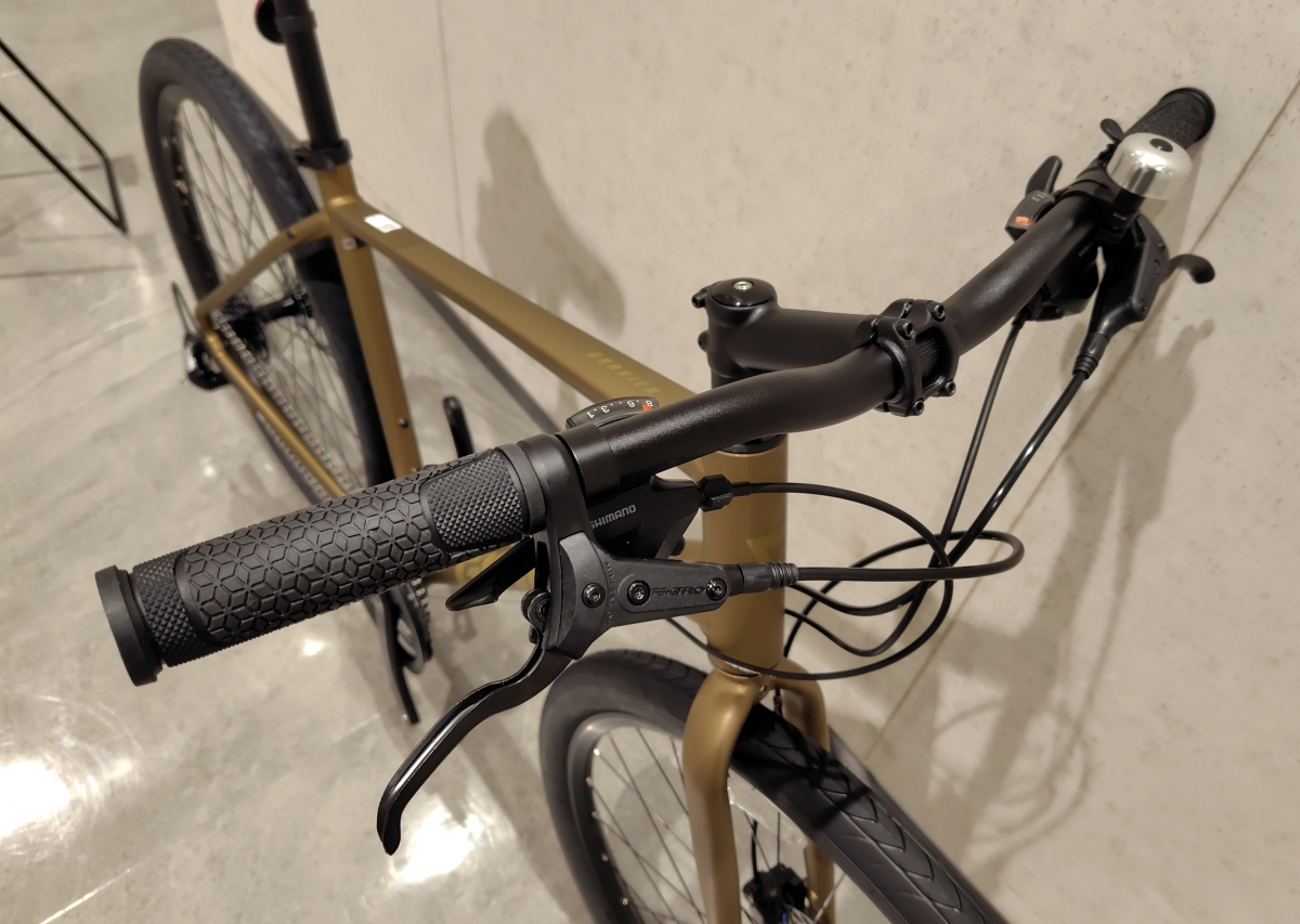 ハンドルは少しアップライズした形状でハンドル幅はXSが560mm、S、M、Lが580mmとなっています。ステムは上向きに角度がついたタイプで長さはXS、Sサイズが90mm、M、Lサイズが105mmとなっています。ライズしたハンドルと上向きなステムの組み合わせで楽な姿勢をとる事ができます。グリップはシンプルな丸型で、ブレーキレバーはテクトロ、シフトレバーはシマノとなっております。
