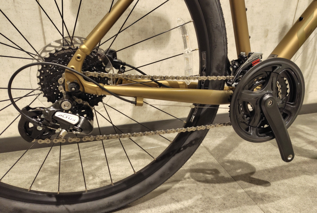 クランク周りはチェーンリングにチェーンガードが付いた48-38-28Tのトリプル仕様、リヤのスプロケット11-32Tの8速なので、全24段変速です。ワイドなギヤ設定なので様々な路面状況を快適に走れます。装着しているタイヤは700cよりホイール径が小さい27.5インチで幅は1.75インチです。700Cよりホイール径は小さいですが、一般的なクロスバイクより太めなタイヤサイズなので空気量も多く、快適性や安定性が高い車体となっています。。