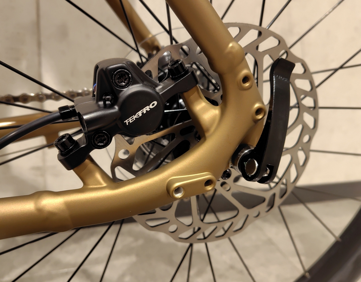 ブレーキキャリパーはレバー同様テクトロです。 全天候で安定した性能を発揮してくれる油圧ディスクブレーキは通勤通学でもサイクリングでも有用です。ブレーキキャリパーの下にあるダボ穴はキックスタンドの台座になります。ご入用でしたら純正パーツか互換パーツをお選び頂けます。