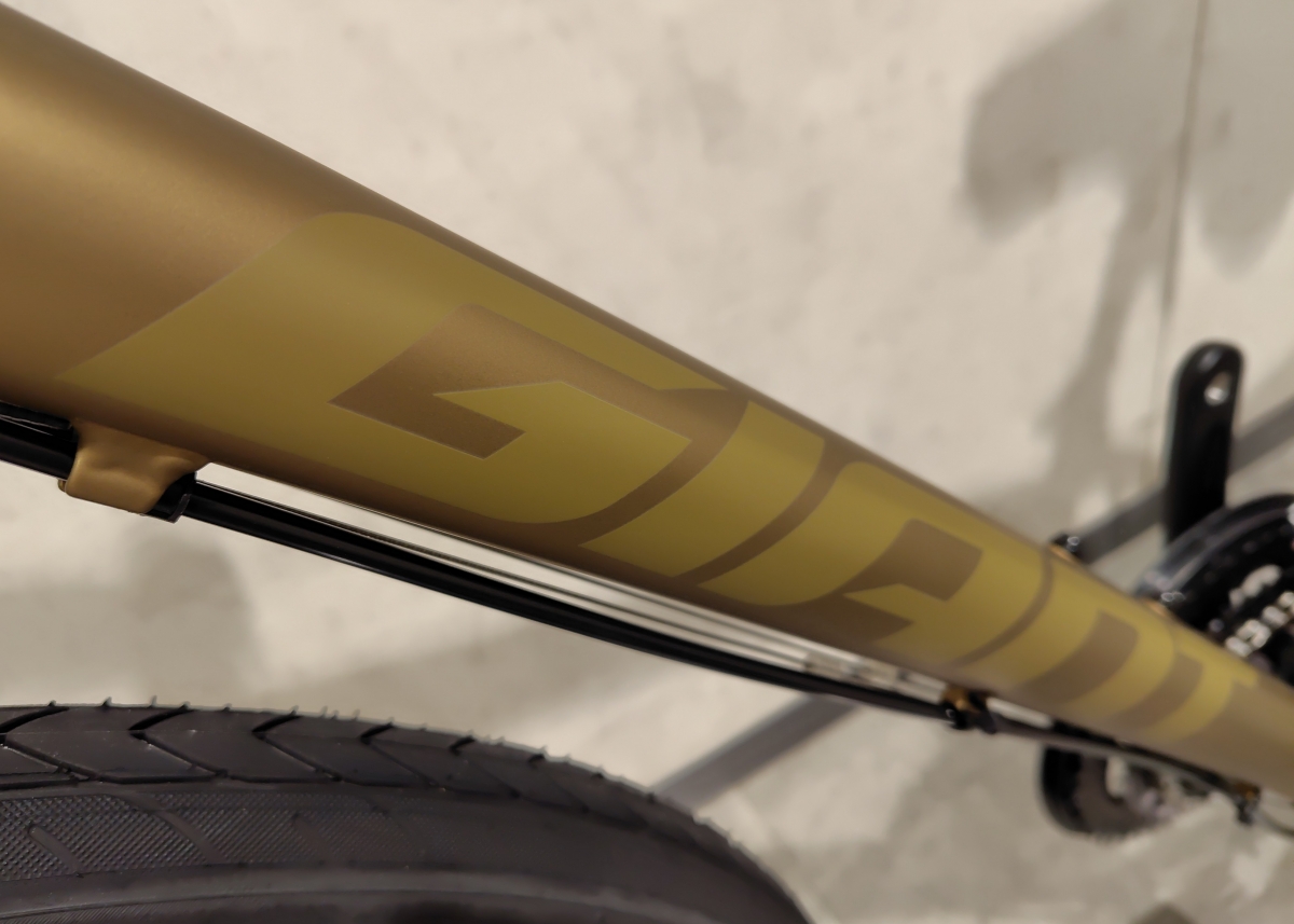 2026年モデルのGRAVIERシリーズは全色マットカラーです。こちらのカラーはマットサンド、マットゴールドではございません。一番派手なカラーリングですが、マットなので比較的落ち着いた見た目になっています。ロードバイクだと百な式みたいなのとかナイトのゴールドみたいなカラーデザインのド派手でカッコいいフレームがあったと記憶していますが。