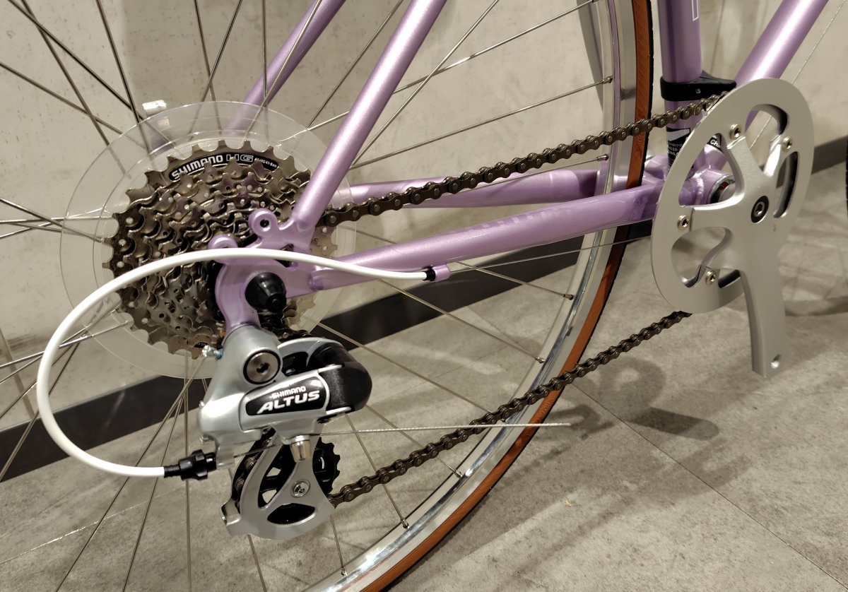 クランクはアルミ製でチェーンガード付きの44Tチェーンリング、リヤのスプロケットは11-30Tの8段変速なので、シティクルージングやサイクリングに使いやすいギヤ構成です。