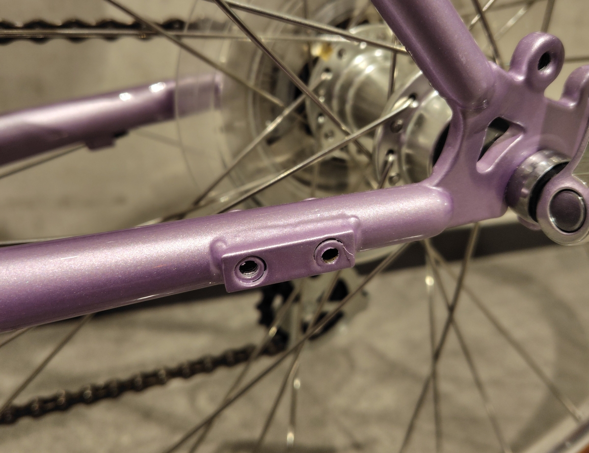 左側チェーンステーのエンド近くにキックスタンドの取付台座があります。純正パーツはございませんので互換パーツを使用します。ボルトは別途必要になりますのでご注意を。