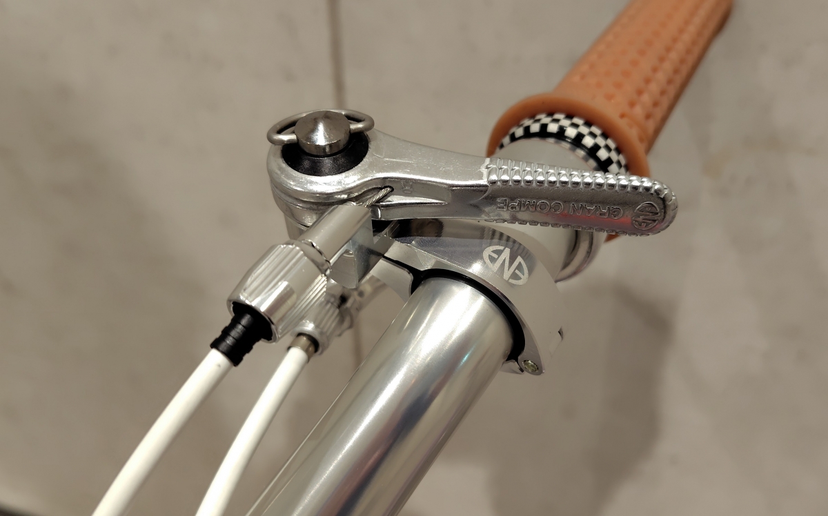 ハンドルはストレートバーからアップライズした形状にしています。幅は540mmです。グリップはODIのVANS V2.1ロックオングリップ、変速レバーをDIA COMPEのサムシフターにカスタムしています。ハンドル、グリップ、変速レバーを変えているので、元のハンドル周りとは印象がかなり変わっています。