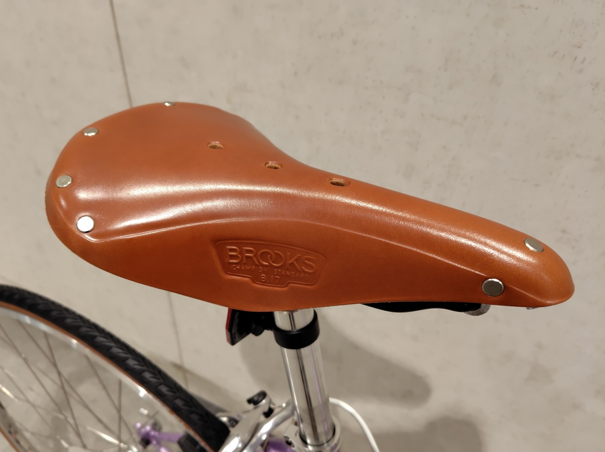 B17は100年以上(B17の発表は1888年)に渡って生産されるブルックスの定番のクラシックモデルです。ブラックカラーのスチールフレームと小さな鋲が長い歴史を感じさせますね。開発された当時は自転車のサドルが木製で、レザーを使用したサドルは最先端だったそうです。現在でも当時と同じ製法で製造されているサドルなので、ランドナーやスポルティーフなどのツーリングモデルにマッチしますね。