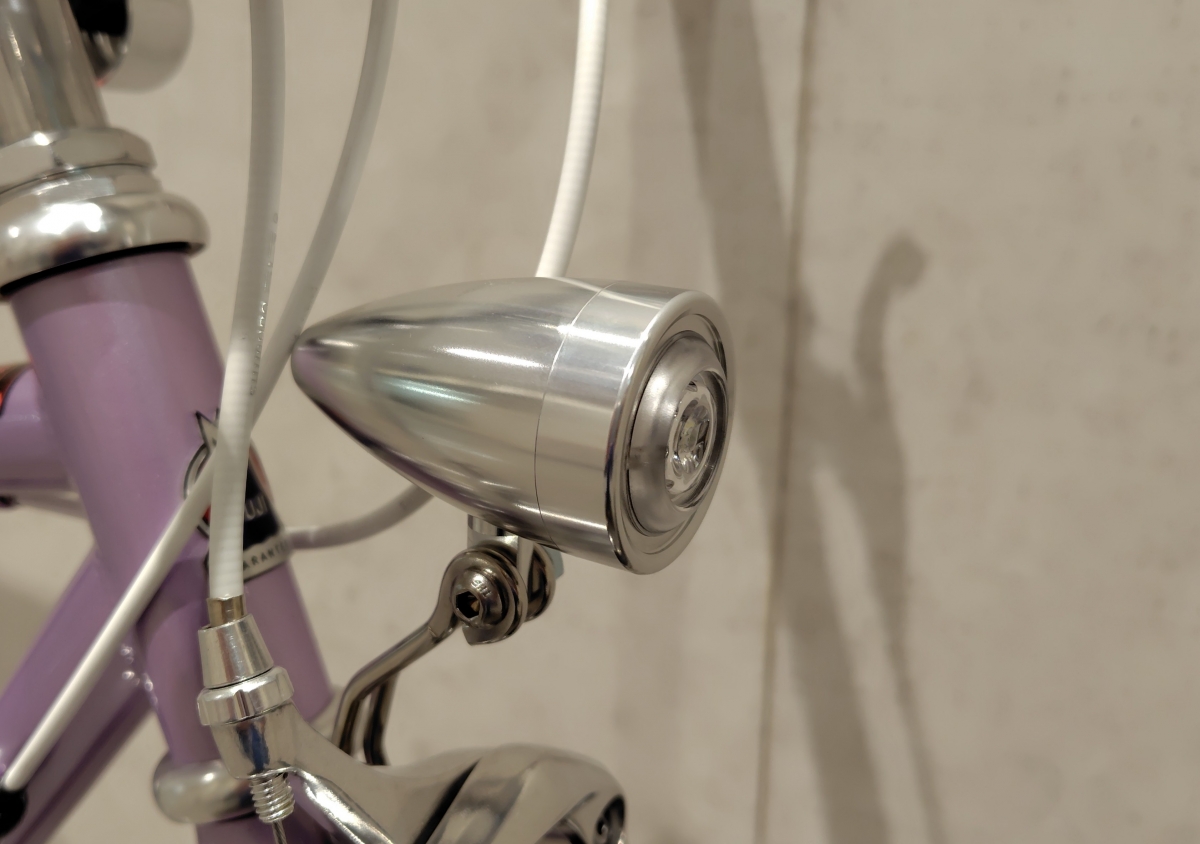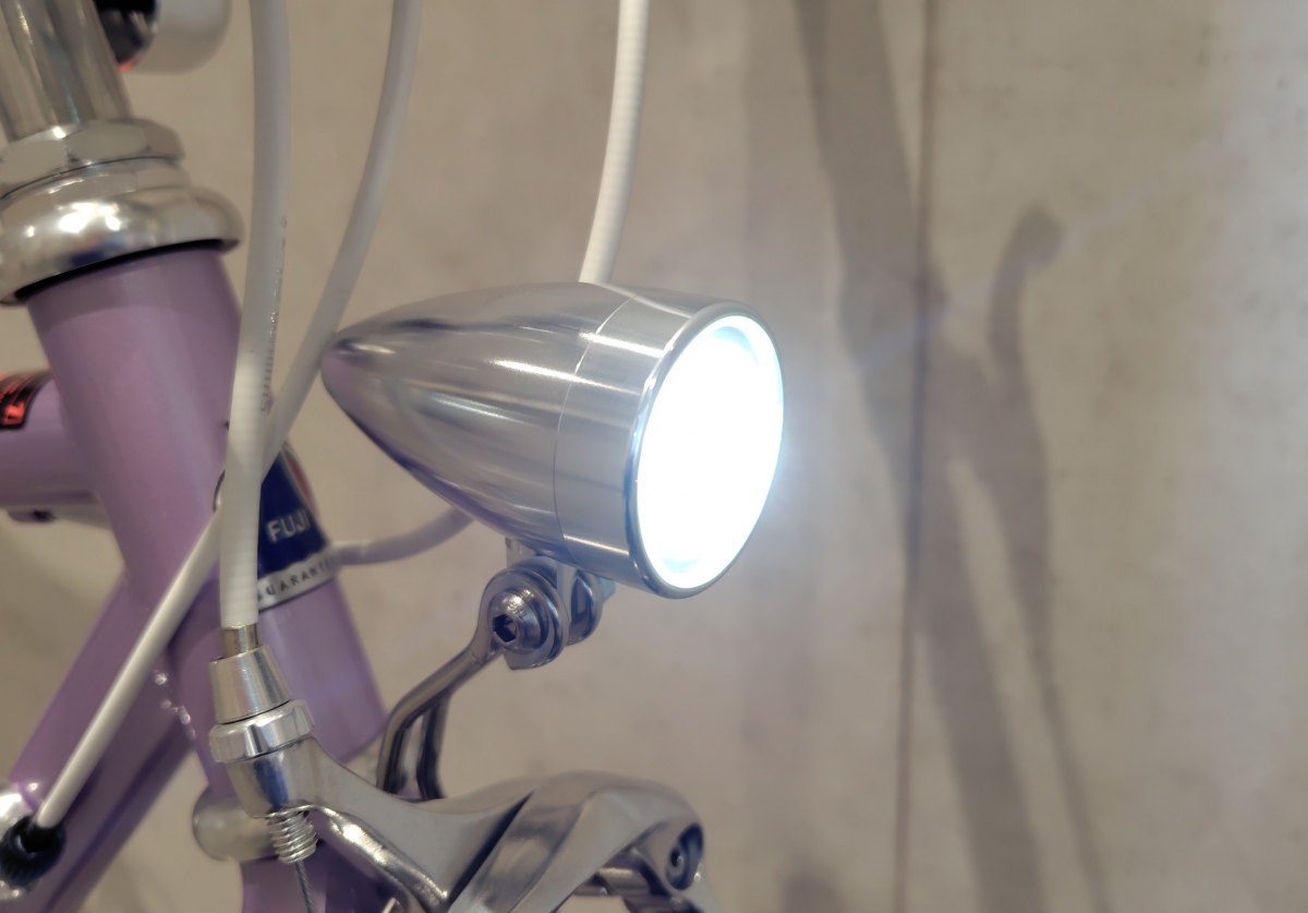 キーレイの充電式の砲弾型ライトです。旧い自転車のダイナモ発電用ライトを模したデザインですが、半分程度の大きさで充電式ライトならではの明るさがあります。充電は本体を砲弾型マウントから外して、専用の充電ケーブルで行います。ライトのオンオフはレンズ部分を押してください。レンズ部分がスイッチになっています。