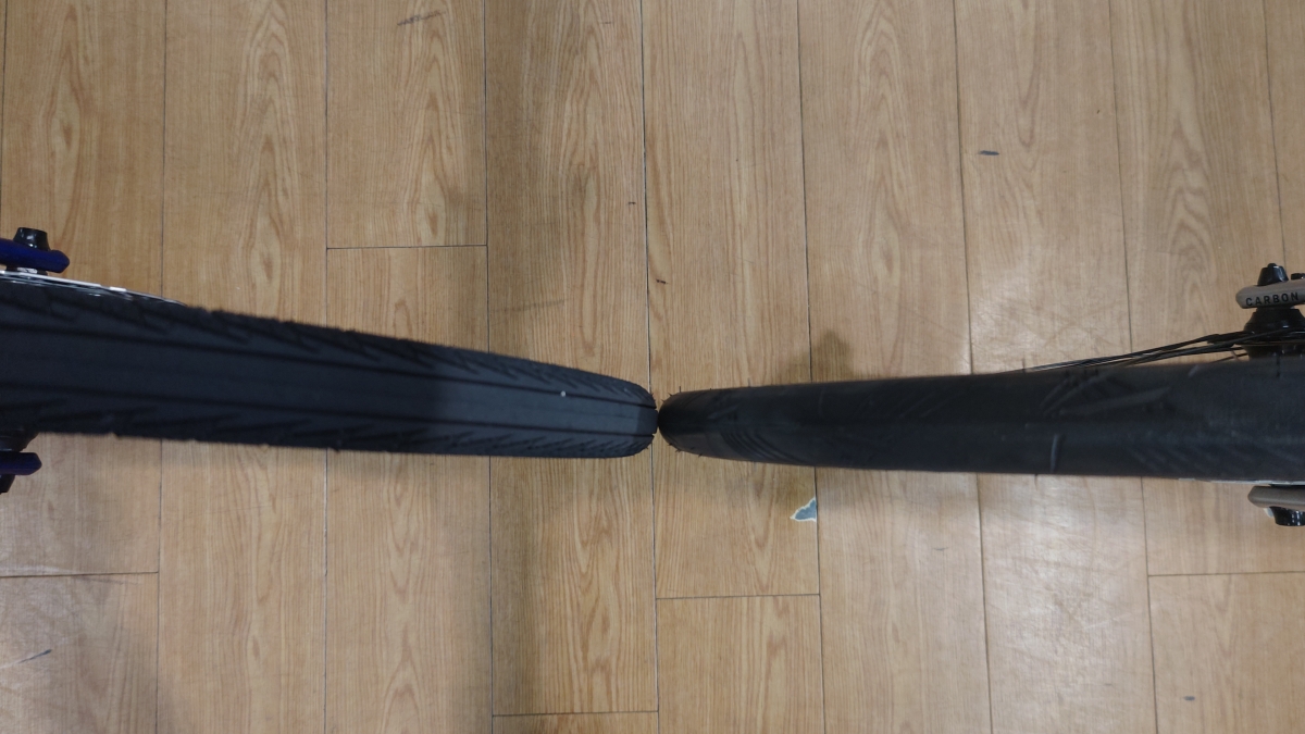 細く見える理由はETRTO規格の新旧の違い。左は旧ETRTO、右は新ETRTO規格で考えられているからですね。この辺はだいぶややこしい話になるので割愛しますが、表示サイズが同じでも新旧ETRTOの違いでこれだけ違うというのがお分かりいただけると思います。