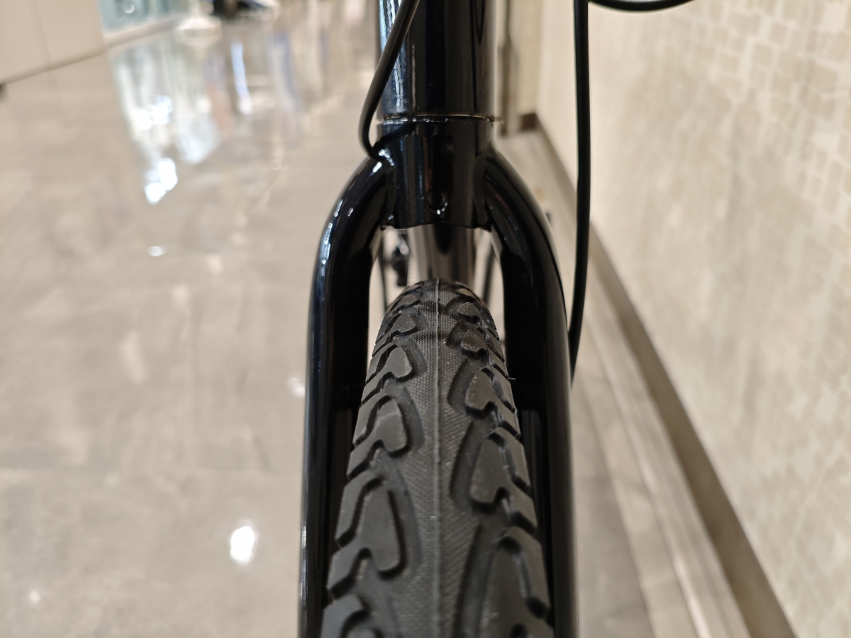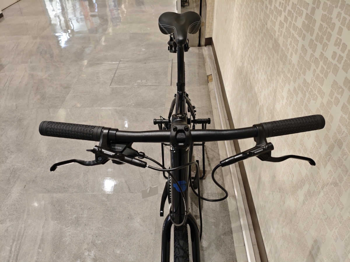 ハンドルは540mm幅のフラットバーが採用されています。幅が広い方ではありませんが、タウンライドでは適度にコンパクトな方がストレスが少ないと感じます。フロントにラック取付などを検討されるのであれば、もう少し幅は欲しくなるかもしれないので、その場合はハンドル交換もおすすめですよ。