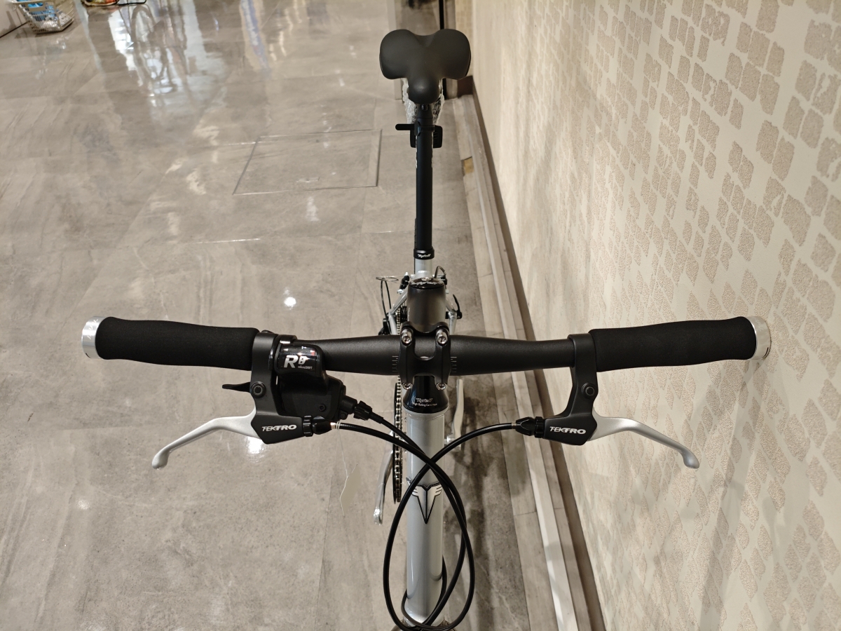 ハンドルはコンパクトな520mm幅のフラットハンドル。街中での取り回しの良さを重視していますね。