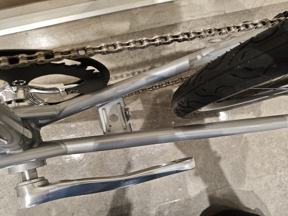 リアフレーム周辺。リアラックは問題ありませんが、タイヤクリアランスを大きく取っているためフルフェンダー用のステーが遠いですね。取付は可能ですが20×2.0用のものを隙間を開けて取付するか、DIYで首長ナットを使ったり取付金具を延長したりと工夫が必要です。