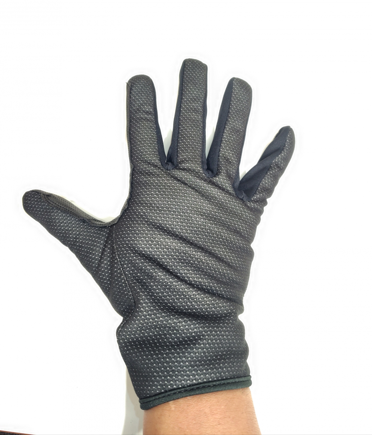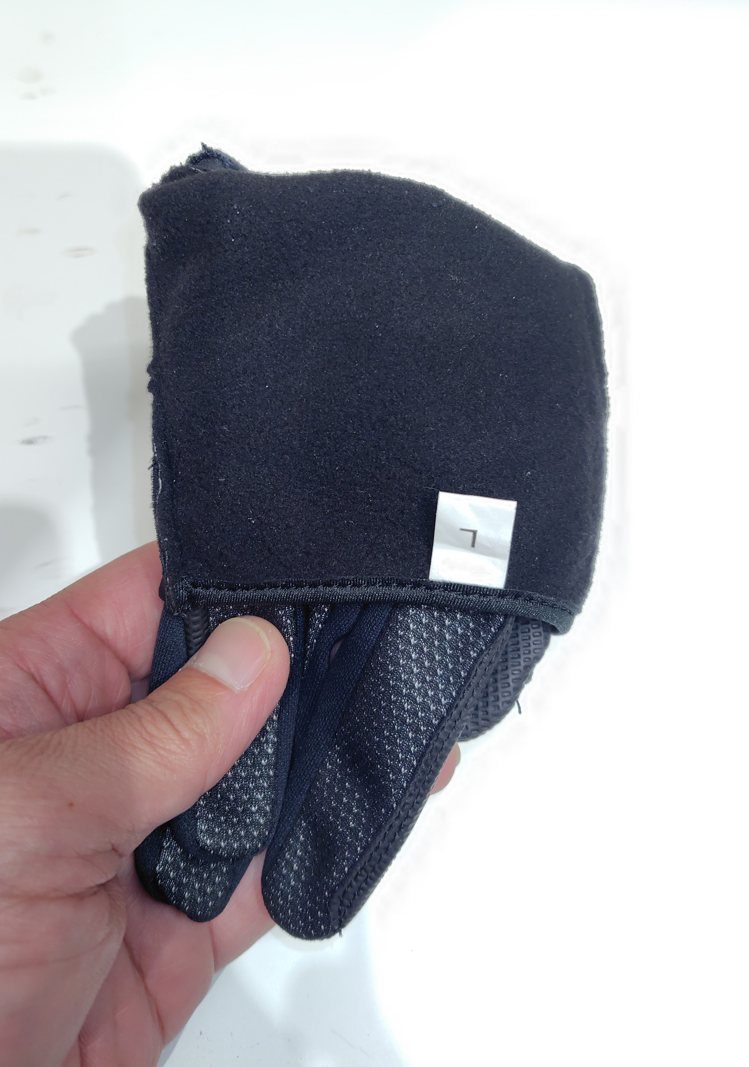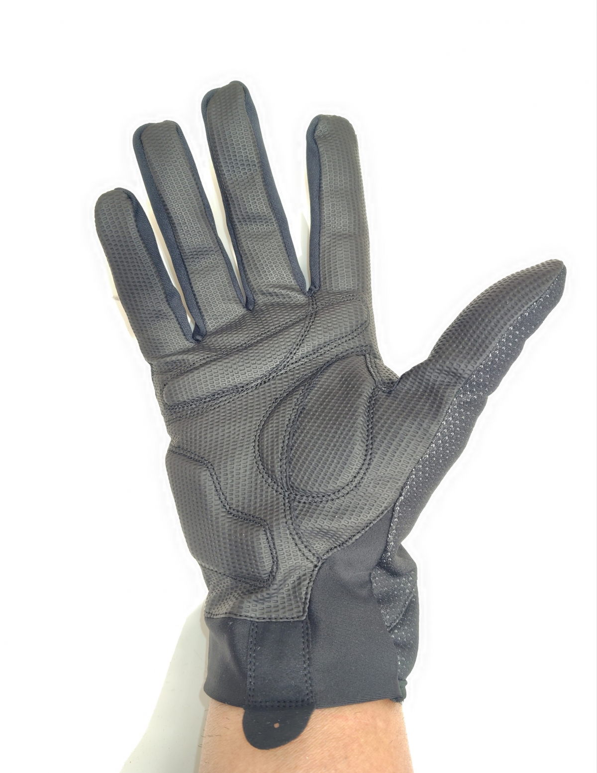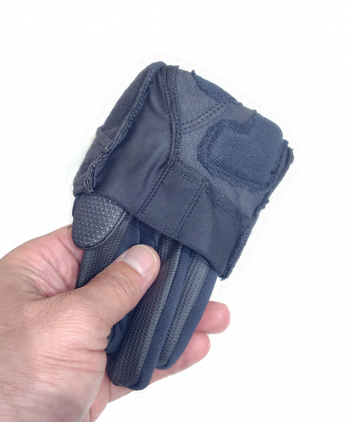 内側はグリップがよく、クッション性の良いパッドが配置されています。手首の部分はベルクロ等はないので脱着しやすく、ウィンタージャケットの裾に入れても出す時にマジックテープが引っ掛かる事がありません。手首をしっかりと固定したい方はちょっと合わないかもです。グローブはストレッチ素材が使われているので全体を適度に包み込んでくれる感じです。