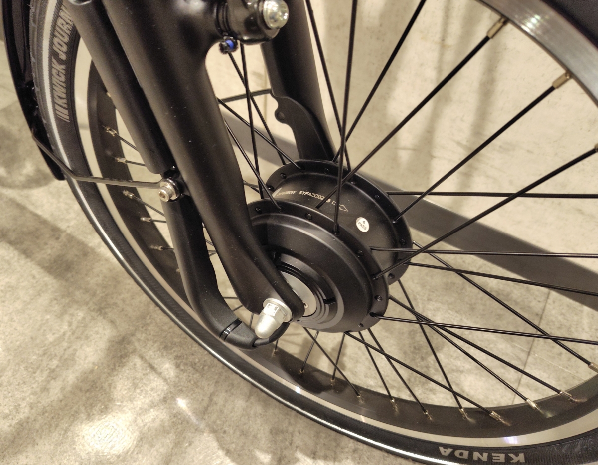 アシスト用のモーターは前輪の軸部分にあります。バッテリーがサドル下にあるので重量バランスは少し良いです。アシストは前側に引っ張られるような感じで働きます。レスポンスはゆったりとしているので、アシスト力が弱くはないですが使いやすい出力の仕方なので走りやすいです。