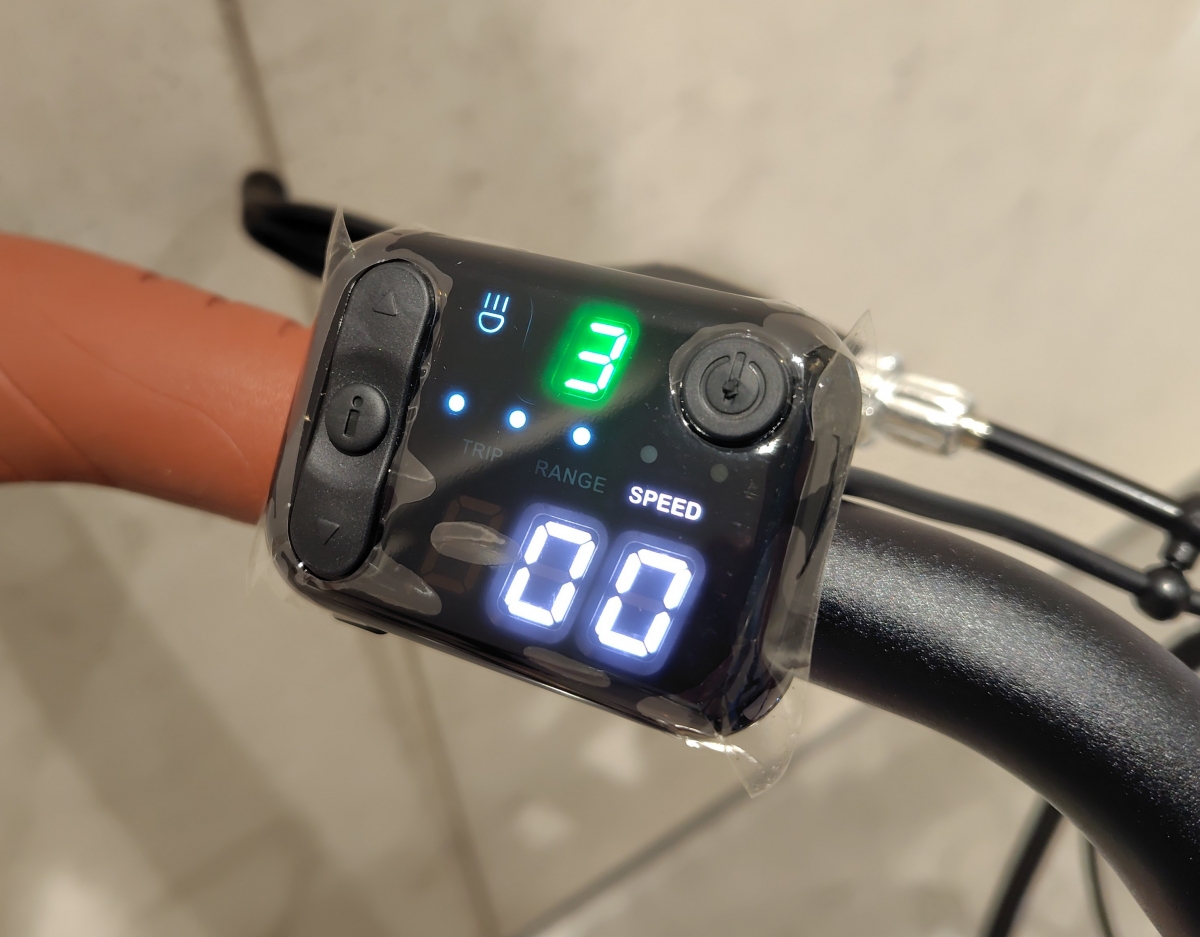 ディスプレイがこちら。右上のボタンが電源ボタン、左側にある上下ボタンでアシストレベルを操作、「i」ボタンで下段の表示内容を変更できます。一番上の数字表示はアシストレベル、真ん中の点々はバッテリーの残量表示です。