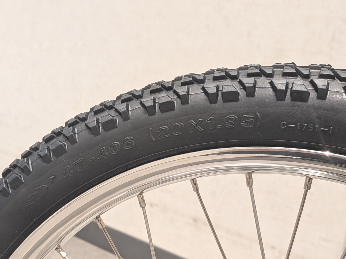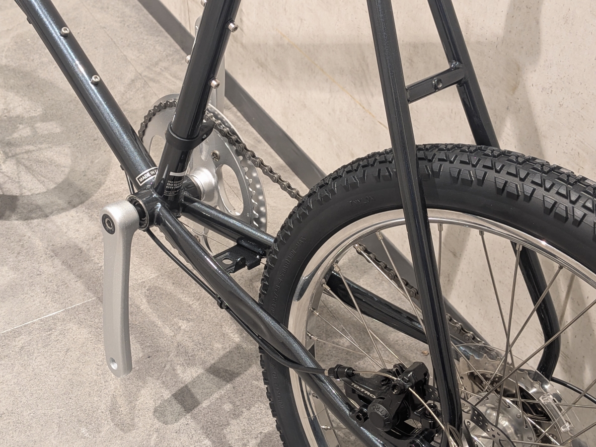 クロモリ製のフレームとフォークのスッキリしたシルエットとは裏腹に、20ⅹ1.95インチという太めなタイヤサイズのコントラストが面白い1台。フレーム各所に設けられたダボ穴のおかげでラックやフェンダー、バスケットも取り付ける事が可能です。センタースタンド台座も用意されているので、日常使いでも問題なし。