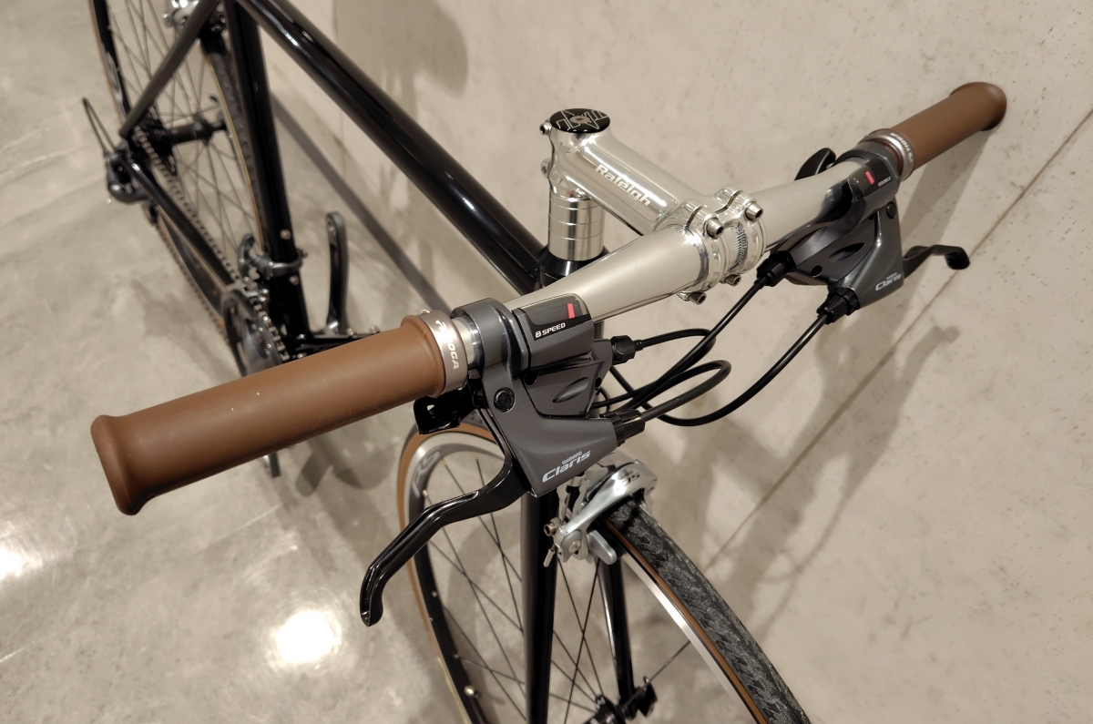 ハンドルは560mm幅のストレートタイプ、ステムは100mm長で7度の角度付きです。グリップは握りやすいTIOGA LOCK-ON BIO GRIP、レバーはシフト、ブレーキレバー一体型のSHIMANO CLARISです。