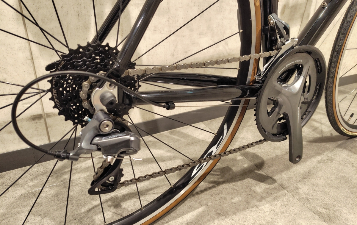 ドライブトレインはSHIMANO CLARISを採用、チェーンリングはチェーンガード付きの50x34T、リヤスプロケットは11-32T(8speed)、全16段変速です。ホイールはSHIMANO WH-RS100(10/11S対応)を装着しており、コンポーネントのグレードを上げたい時にもカスタムしやすくなっています。タイヤは700×25CサイズのPANARACER TOURER PLUSです。ちなみにTNI MK-2のフレームは700x28cが推奨最大タイヤサイズになります。