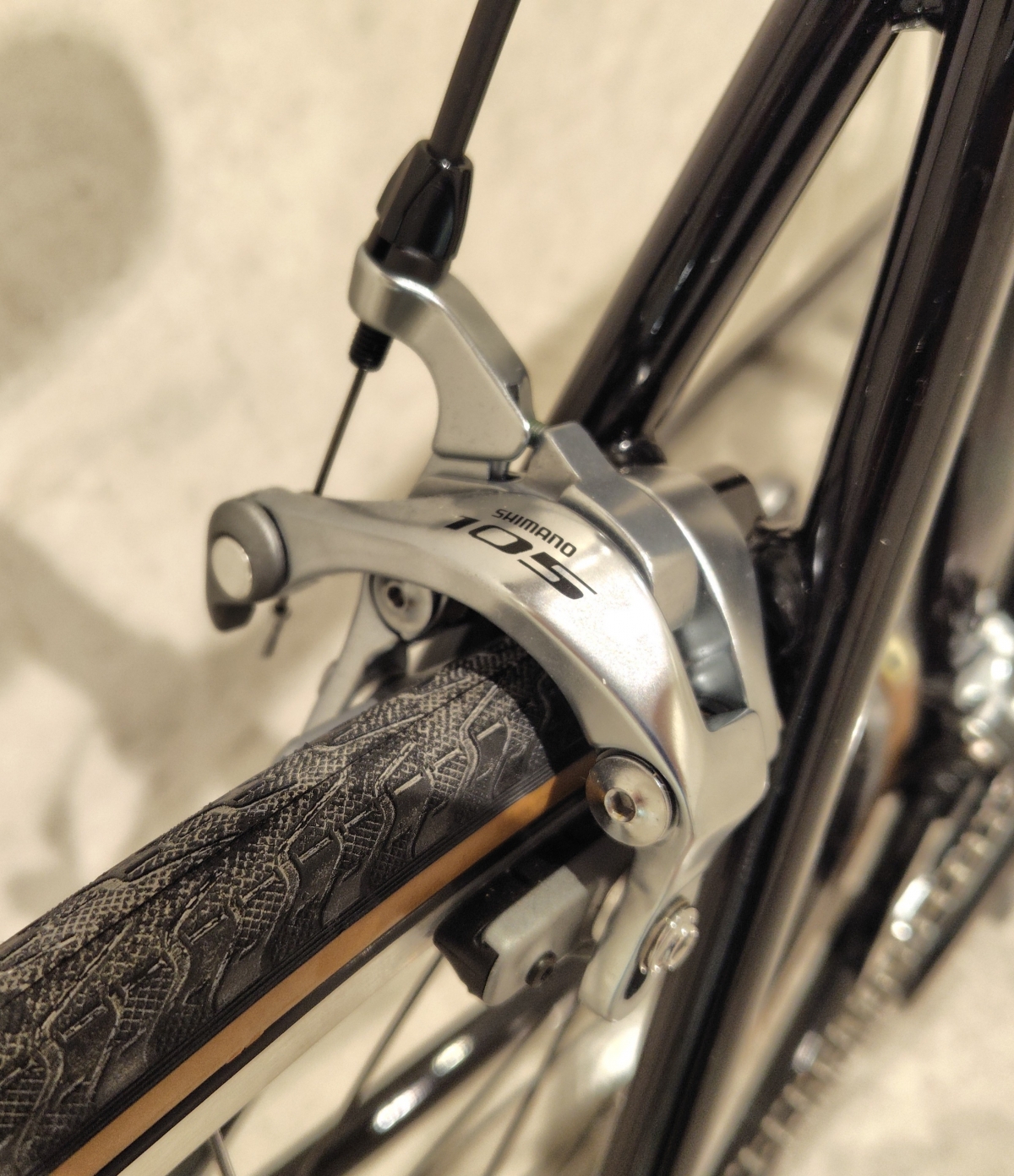 ブレーキキャリパーはSHIMANO BR-5800の105キャリパーブレーキになります。ロードバイクのキャリパーブレーキはスピードをコントロールすると言う性能上しなやかなブレーキフィーリングですが、同世代のデュラ、アルテに比べるとちょっと強めに効く感じでしたね。ブレーキの効きが良いのは良い事ですが。