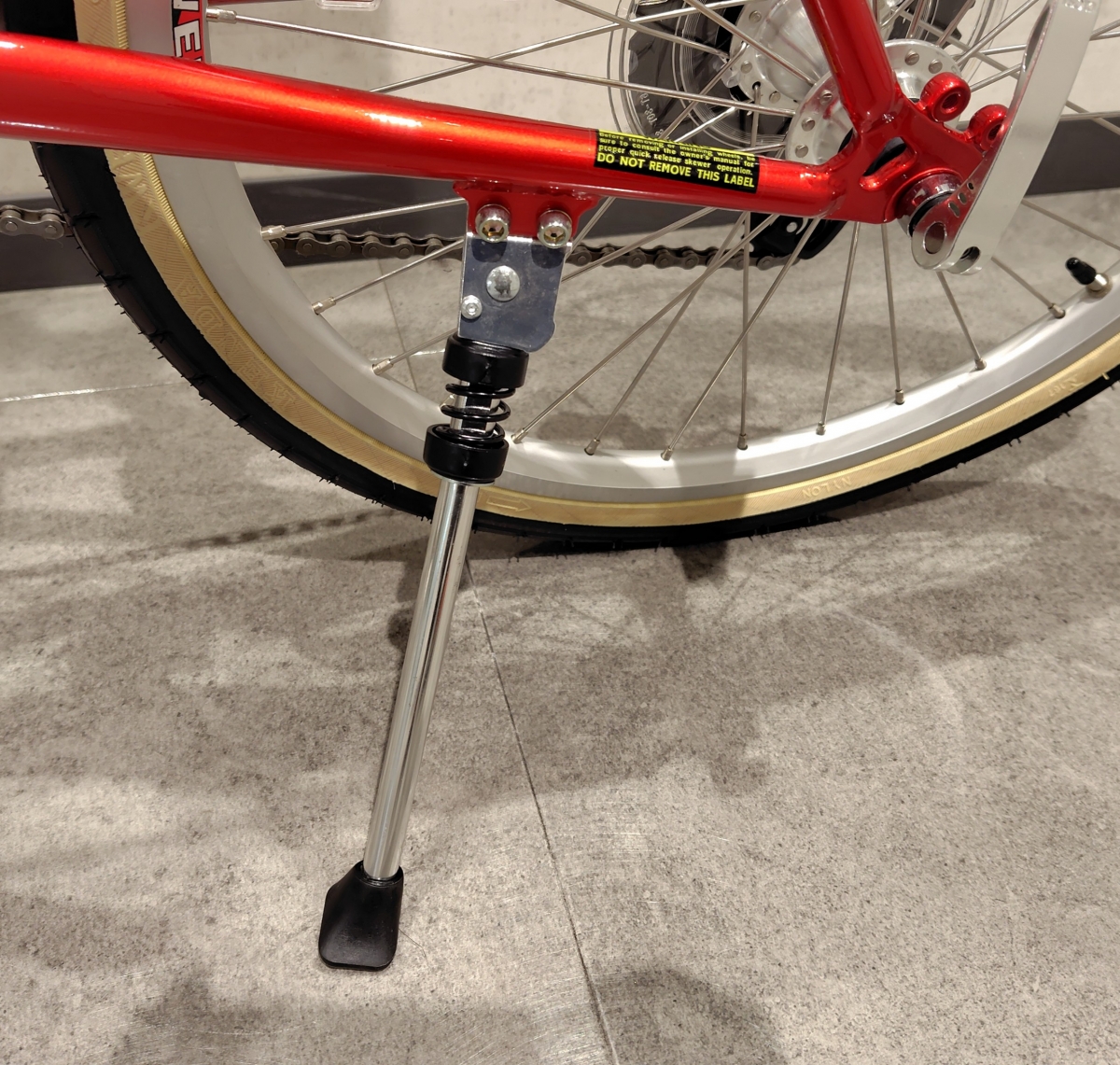 サイドキッススタンドが標準装備です。なくても二つ折りにして止める事はできますが、キックスタンドはあると気軽に立てられて便利ですね。軽量化するなら外しても良いかも!?