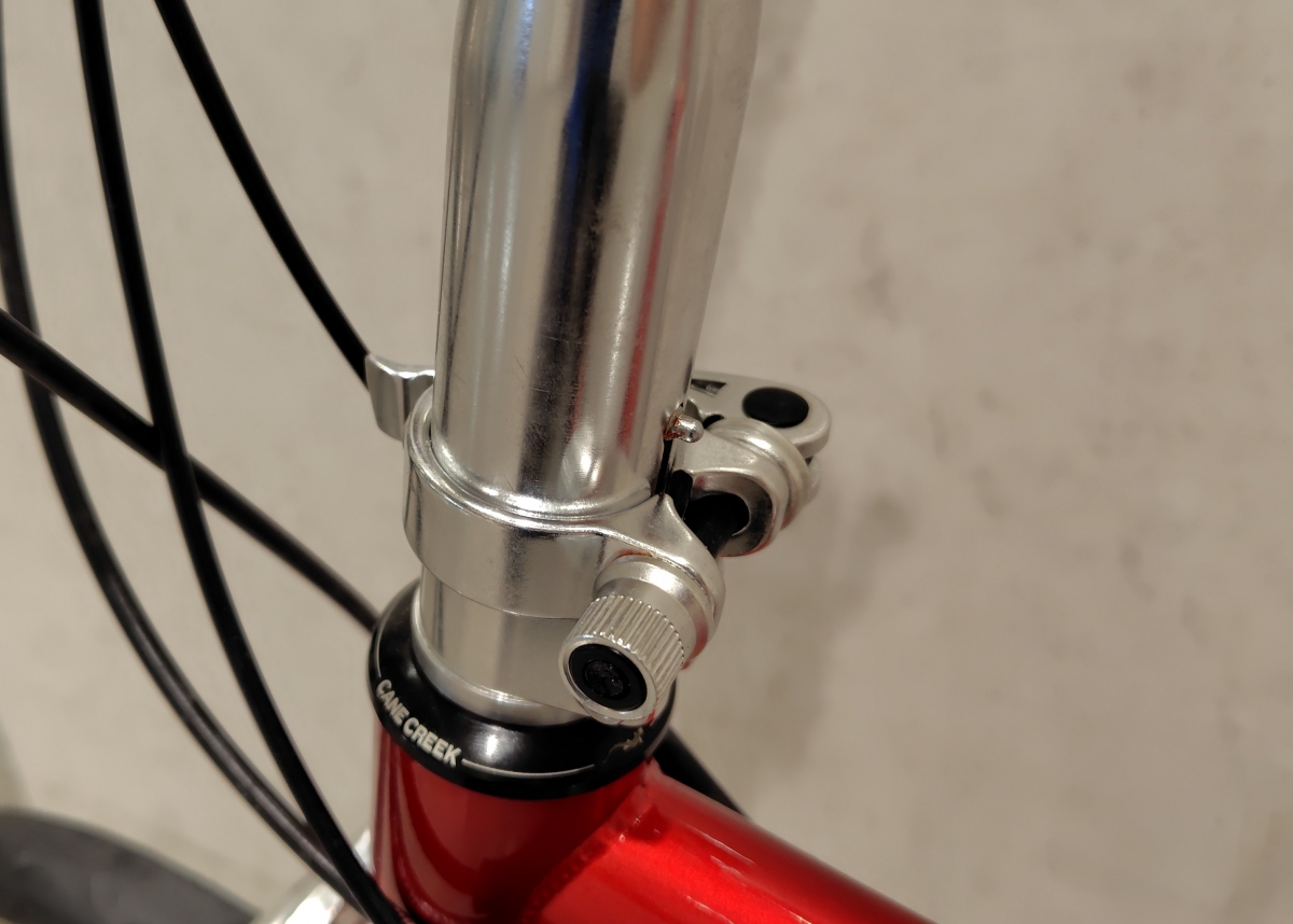 ヘッドチューブ上側のクイックレバーを開放してから、レバーの上に見えるボタンを押すと簡単にハンドル部分がはずれます。また取り付る際にセンターが出るようになっている為、センタリングの調整が不要です。はずしたハンドル部分は別売の「ハンドルコラム取付アダプター」を取付けて固定しますが、アダプターがない場合はハンドル部分がフリーな状態になるので持ち運ぶ時に袋の中で不安定になります。折り畳んだ状態を維持する「フォールディングマグネットセット」もあると便利ですが、この2点がない場合はマジック結束バンドなどが必要になります。輪行をされる際には事前に折り畳んでみて、どのような感じになるか確認をしてみましょう。