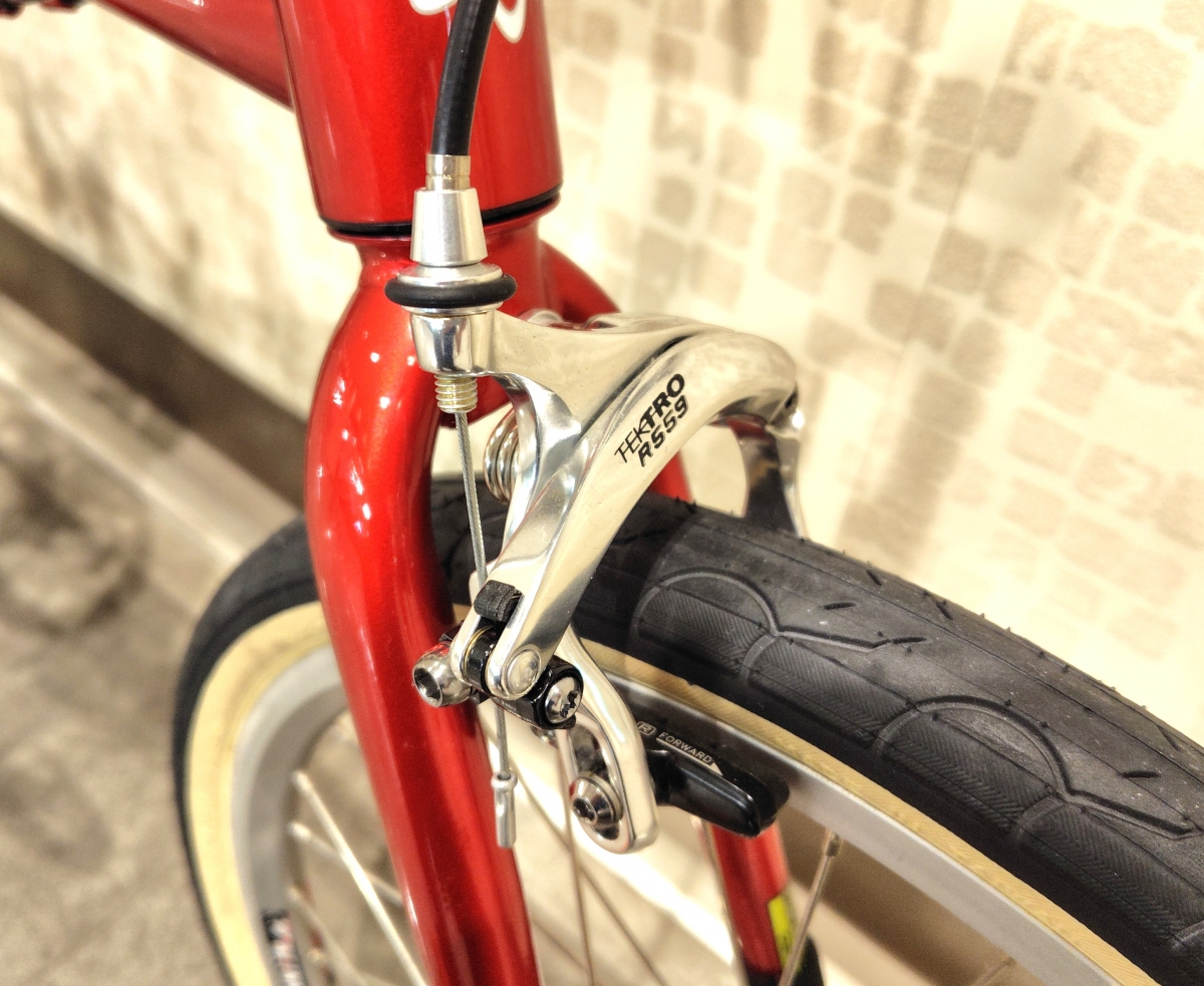ブレーキキャリパーはテクトロのロングアーチタイプです。リーチは55-73mmとけっこう長めのアームです。通常のロードバイク用キャリパーブレーキは合わないのでご注意ください。