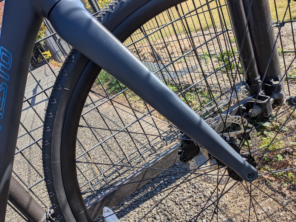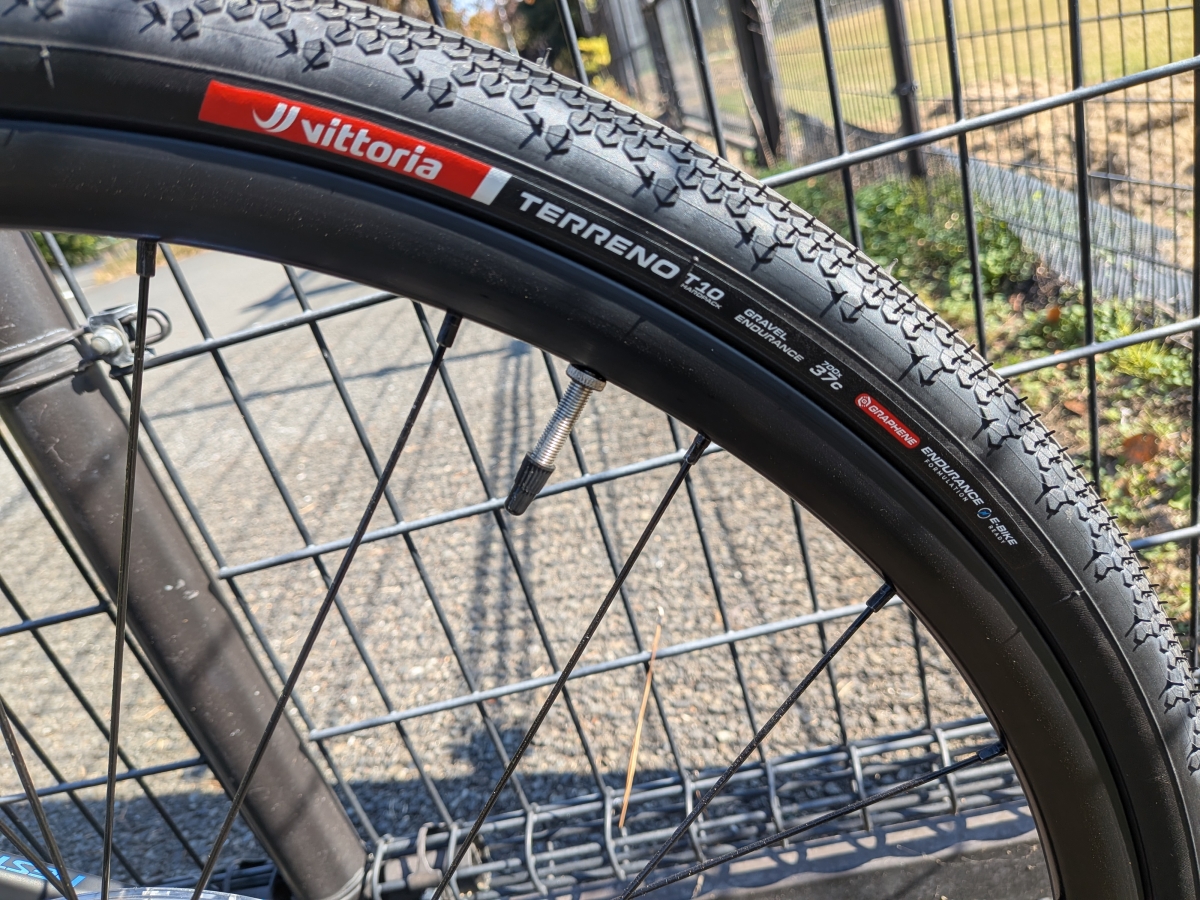 タイヤサイズはデフォルトで700x37Cとそこそこ太めですが、タイヤクリアランスはそこまで広くないので出来ても38Cくらいか、スリックタイヤで40C行けるかな?といったところ。そこまでグラベルライドをすることが無ければ十分でしょう。