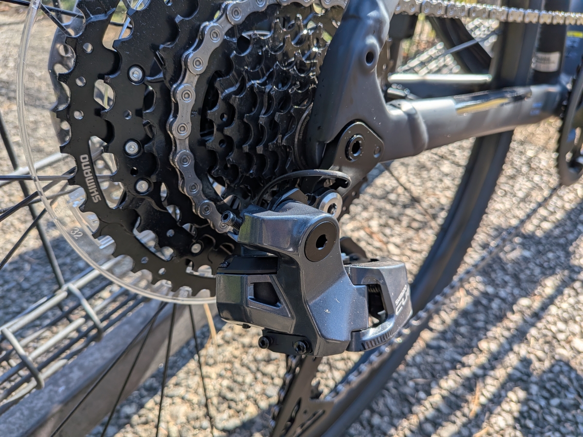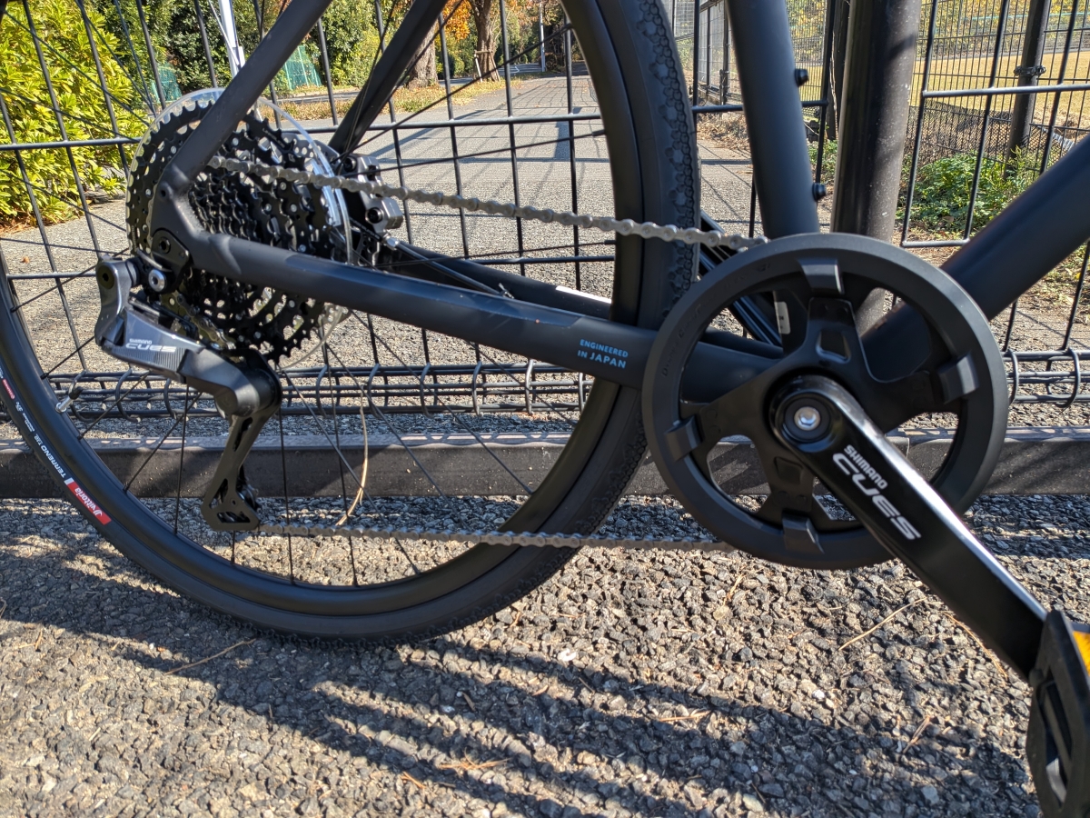 フロントが42T、リアが10Sで11-48Tのスプロケットを装備。重すぎず軽すぎずなちょうどいい感じですね。CUESシリーズは正直なところ変速レスポンスがあまりよくないので、ロードの変速に慣れていると違和感ありかも。