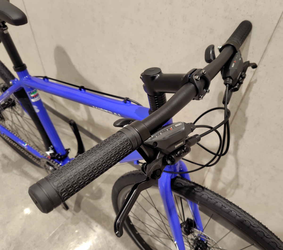 ハンドルは540mm、ステムは90mmと両サイズ共通です。ハンドル形状はスタンダードなストレートタイプ、ステムはちょっと上向きになっているので乗車姿勢が優しめになります。レバーはシマノのブレーキ変速一体型が採用されています。