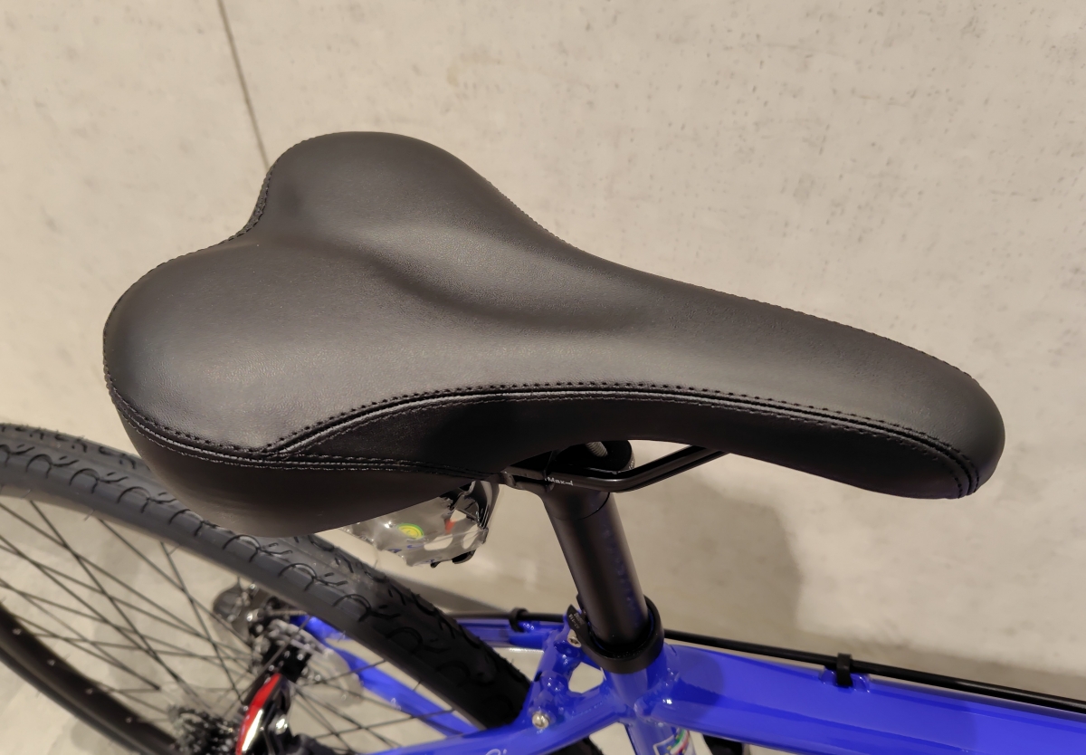 サドルは座面が広く、やわらかめのコンフォートタイプですね。試乗した個人的感想ですが、座ってみるとなかなか快適でお尻の納まりがよかったです。