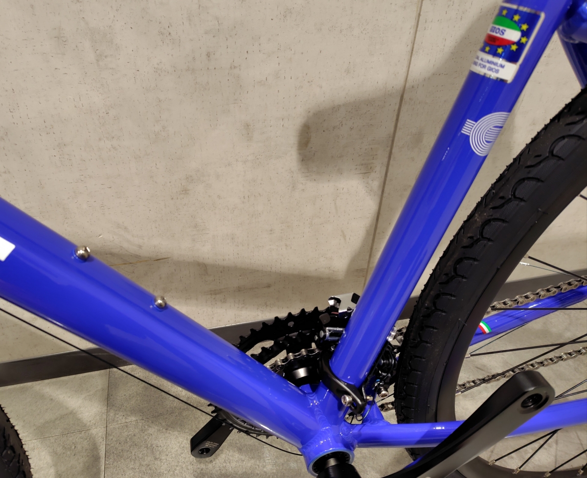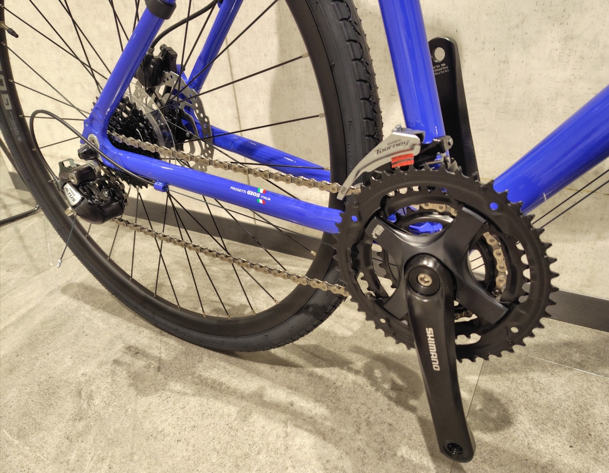 クランクは170mm長、チェーンリングは48x38x28のトリプル、リヤスプロケット11-32Tの8速で全24段変速です。チェーンリングにチェーンガードが付いていないので、スポーティな雰囲気がカッコイイですが、ズボンの裾は汚れやすいのでご注意ください。タイヤサイズは700x32cと気持ち細めです。ディスクブレーキ用ホイールだとリムが黒いので、黒いタイヤとの親和性が高く足回りの見栄えが良いですね。
