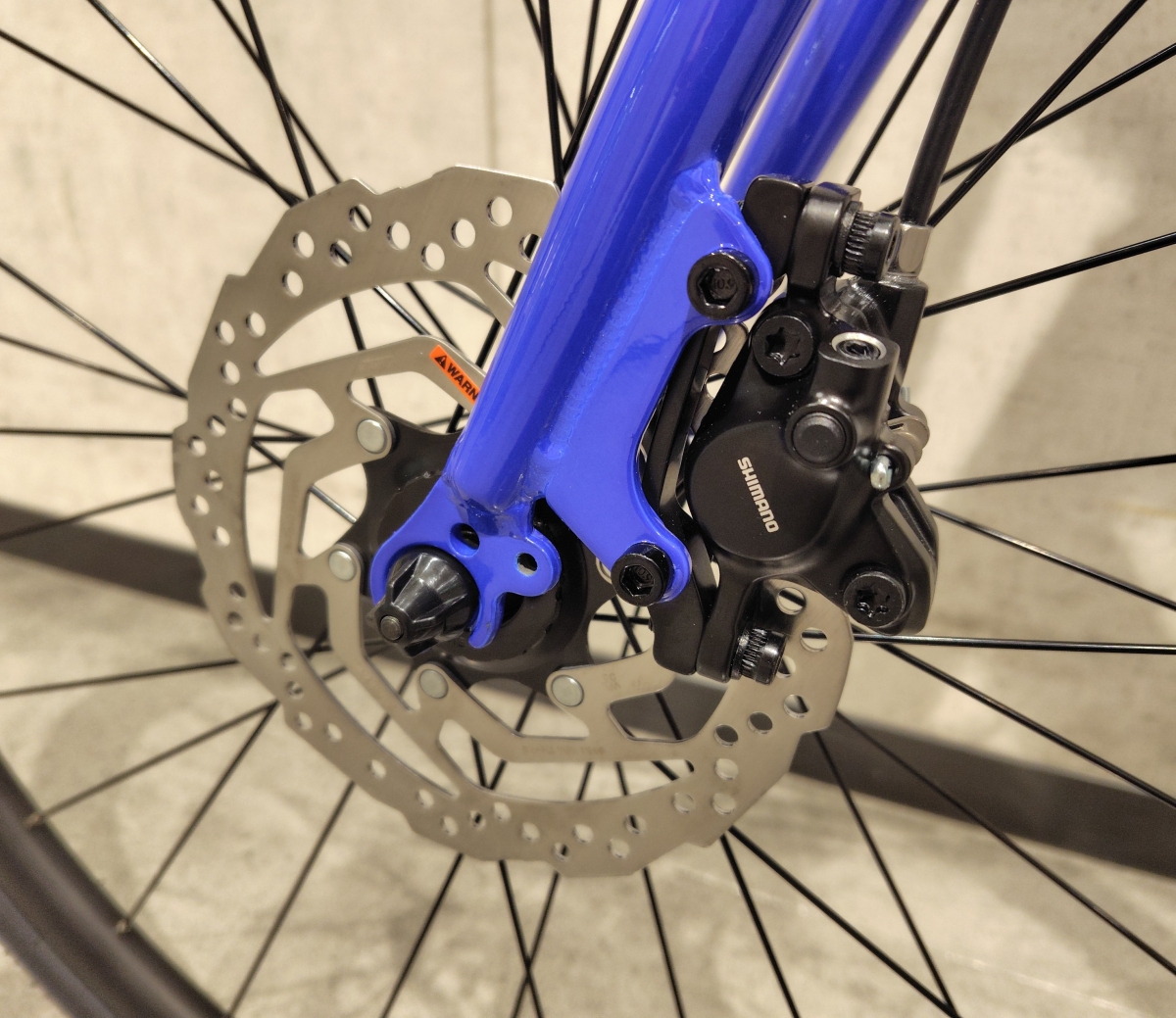 ブレーキはレバー側と同様、シマノの油圧ディスクブレーキです。油圧タイプはレバーの引きが軽く、制動時の効きが安定しているので雨天時での安心感があります。ただし急激に強く握ってしまうとリヤホイールが浮いてしまったりするのでご注意を!