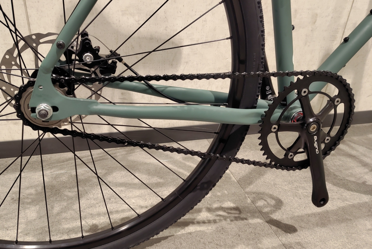 フロントチェーンリング46T、リヤコグ17Tと言うギヤの組み合わせです。同じFUJIのシングルスピードのFEATHERより軽く、STROLLより重いギヤが採用されています。タイヤサイズは700x38cを装着。フレームクリアランスがあるので最大タイヤサイズは700x45cまで装着が可能です!交換時にはチューブの対応サイズにお気を付けください。