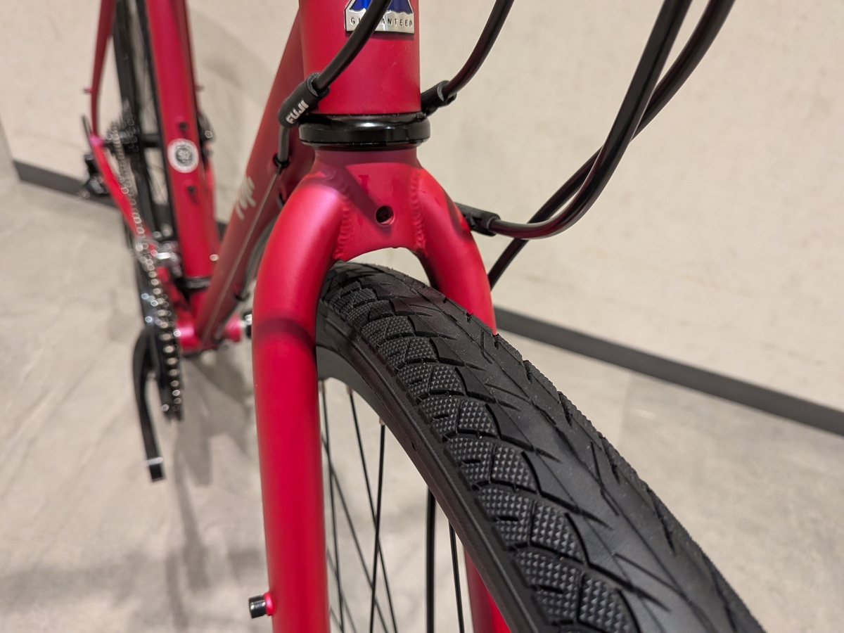 標準で装備されているのは35Cのブロックタイヤ。砂利道などを走りやすくするためのノブですがオンロードだとあまり効果を発揮しないのが残念なところ。FEATHER CX FLATはどちらかというとオンロードをメインに走られる方多いかと思いますので、あまり恩恵が得られないかもしれません。