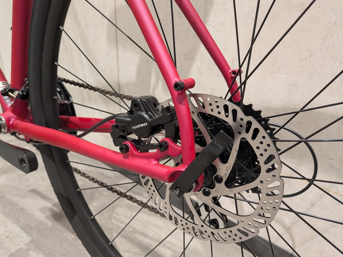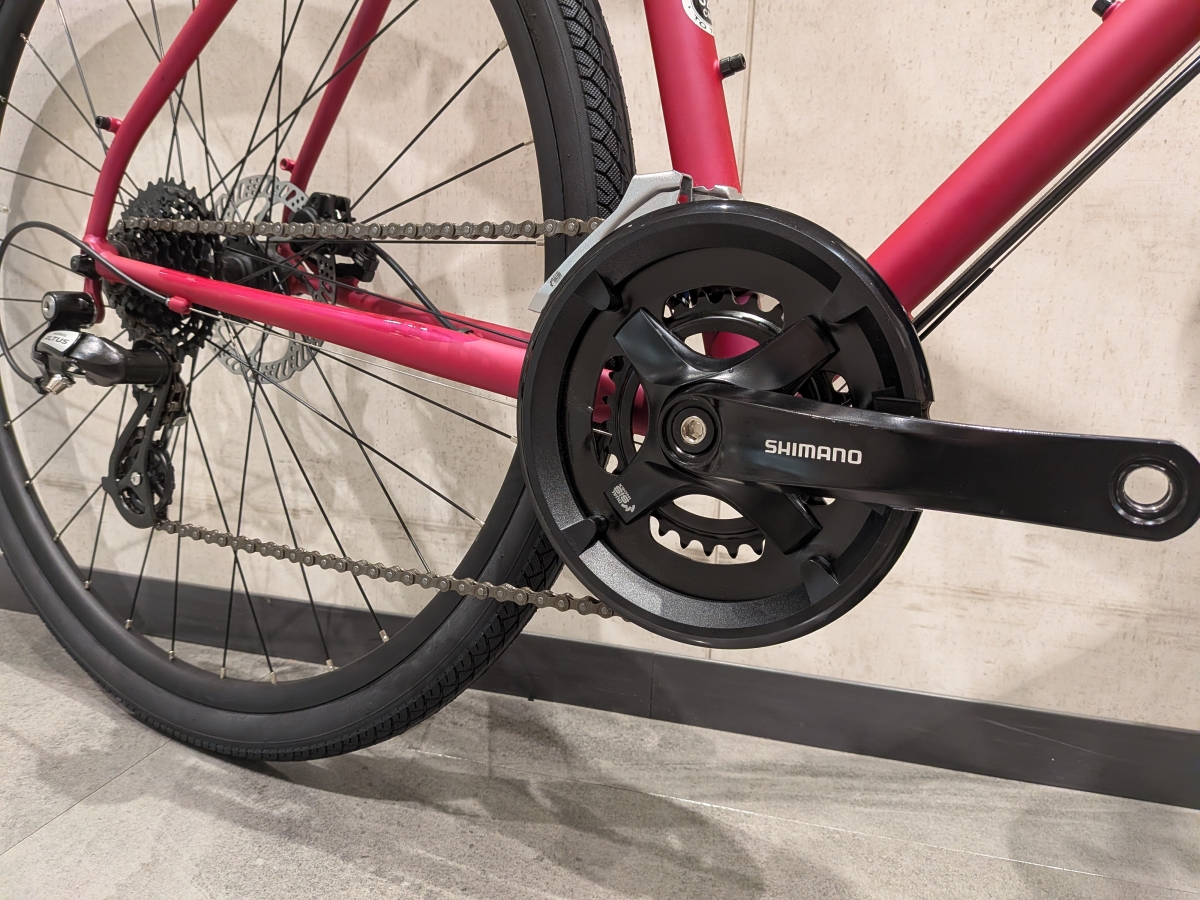 ギア周りはいわゆるクロスバイクなアッセンブリ。街乗りでも使いやすい仕様かと思います。