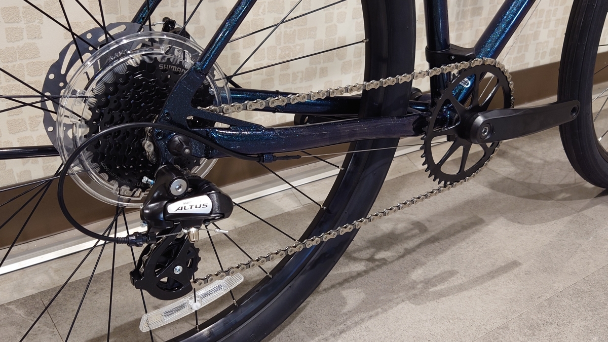 リアの変速は8段で、一般的なフロントシングル用コンポーネントに比べ細かい変速調整が可能なクロスレシオな構成