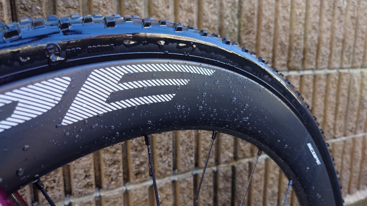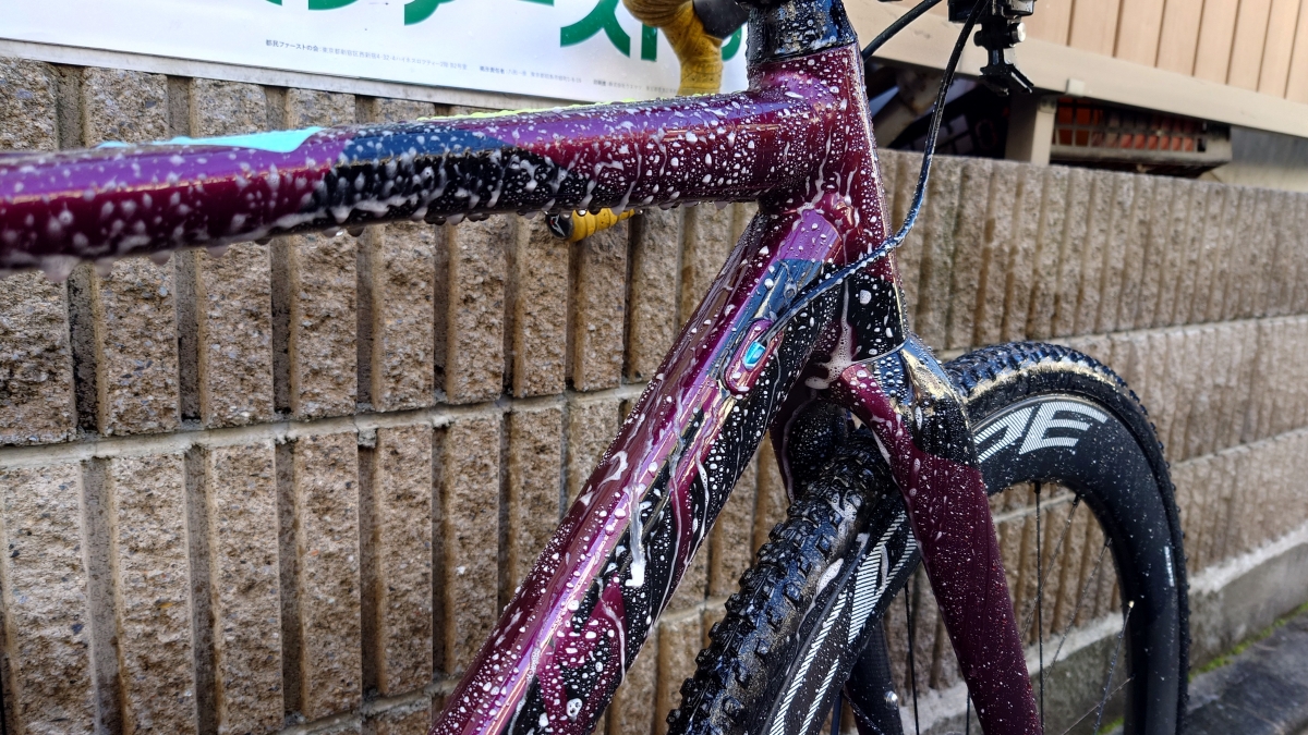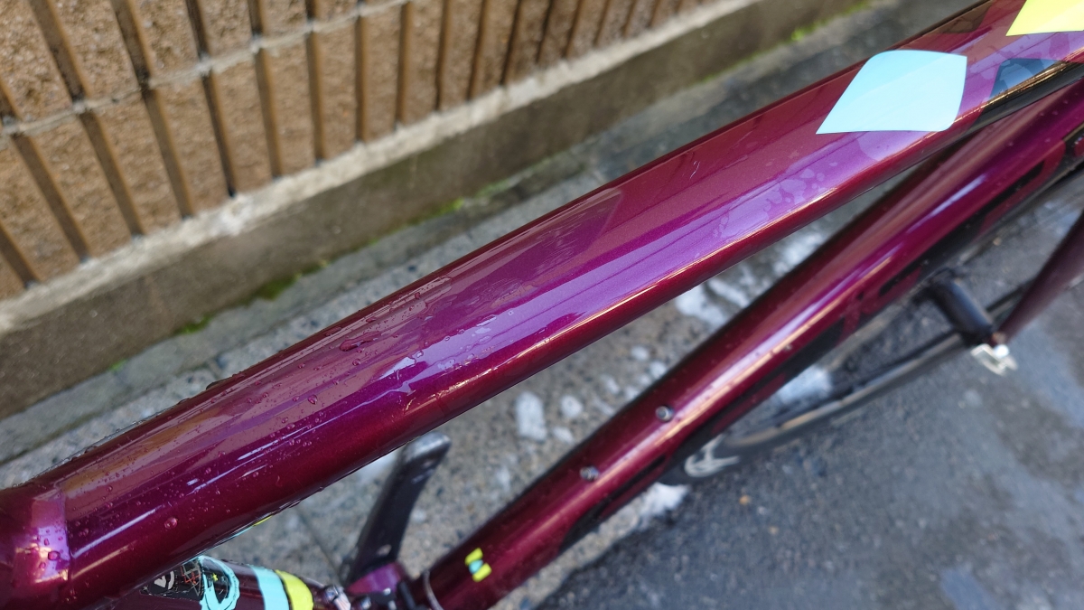 ただ、カー用品なので擦れなどの事を考慮しておらず、身体やウェアが擦れるトップチューブは撥水力が落ちてベッタリと水が付く状態になっていました