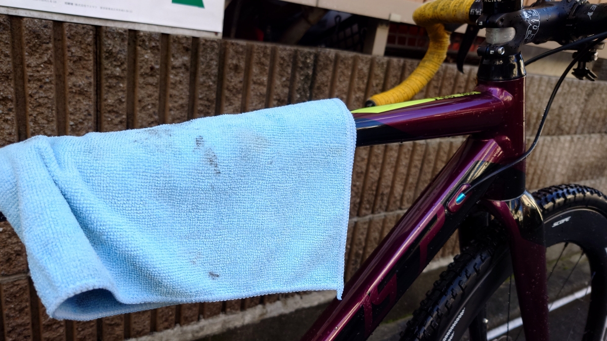 タオルは車体全体用、駆動系用、ブレーキ用で分けて三枚は用意しましょう。(同じタオルで拭くと、油脂が移動してブレーキ音鳴りなどの原因になる場合があります。部位ごとに色の違う物を用意出来ると間違えにくくてなお良し)