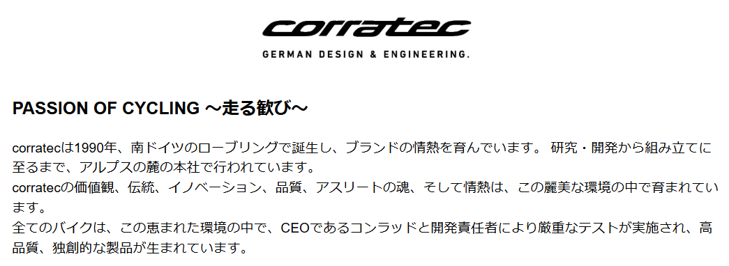 自転車の本場ヨーロッパから、ドイツで生まれたCORRATECはロードバイクやクロスバイクでも人気なブランドのひとつ。日本人の体格に合わせた自転車設計が選ばれる秘訣でもあります。