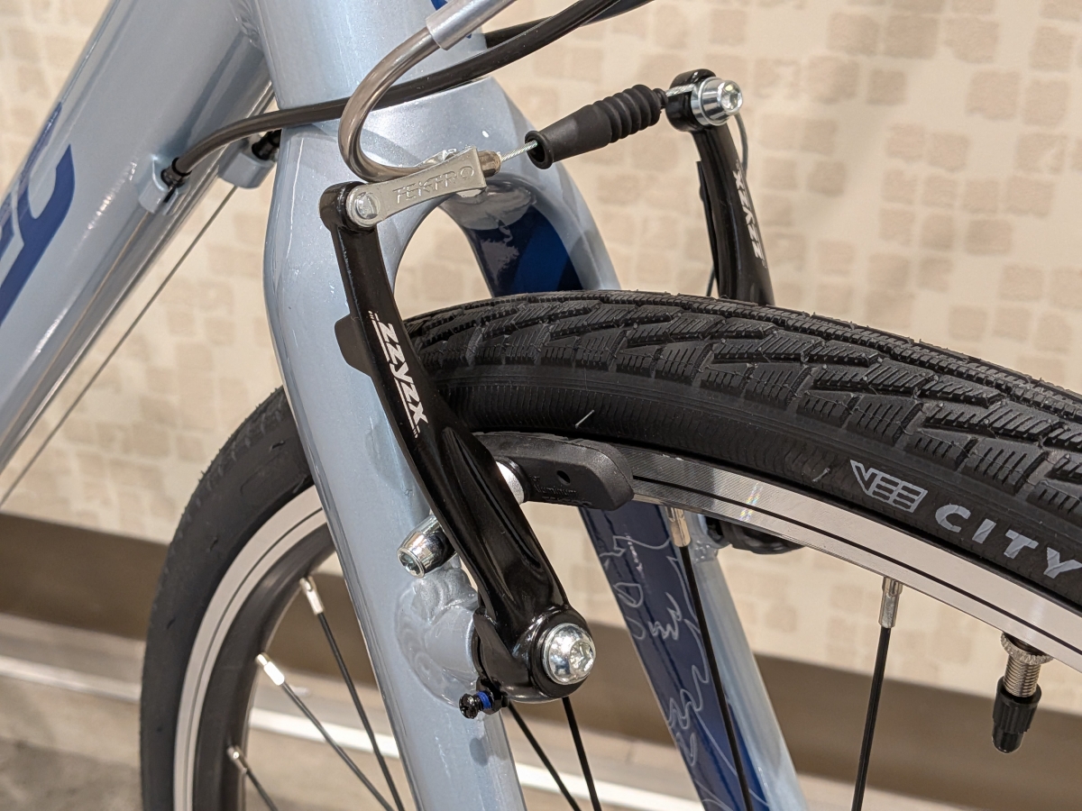 ブレーキにはベーシックなVブレーキを採用。制動力はもちろん、整備性にも優れるブレーキシステムなので修理や点検もしやすい造りとなっていますね。